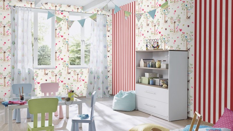 Детская, как и спальня, нуждается в комфортной обстановке. Здесь неуместны мрачные оттенки, приветствуются яркие и веселые, но не отвлекающие от занятий. Комнату для двоих детей можно разделить разного типа обоями на индивидуальные области, игровую зону выделить акцентными полотнами, разнообразить дизайн декоративными наклейками в виде силуэтов животных, геометрических фигур, экзотических растений, ракет и кораблей.