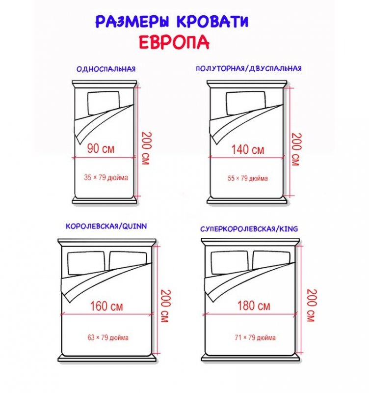 Первое, что стоит обсудить сразу – размеры кроватей. Существует две системы измерения, по которым производители изготавливают постели: метрическая и английская. Последняя больше популярна в США и ряде европейских стран, где счет идет по дюймам; первая считается стандартной, но под стандартной системой нужно больше понимать размеры матраса, нежели кровати. Помните, что единого измерения мебели не существует априори, длина или ширина может варьироваться на 10-20 сантиметров – все сильно зависит от производителя и страны, где была изготовлена кровать. В общих чертах, размерные параметры постели условно делятся на четыре вида:
