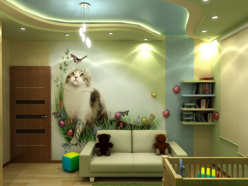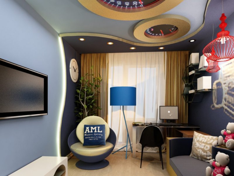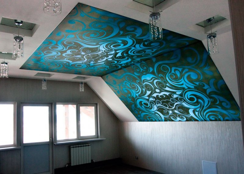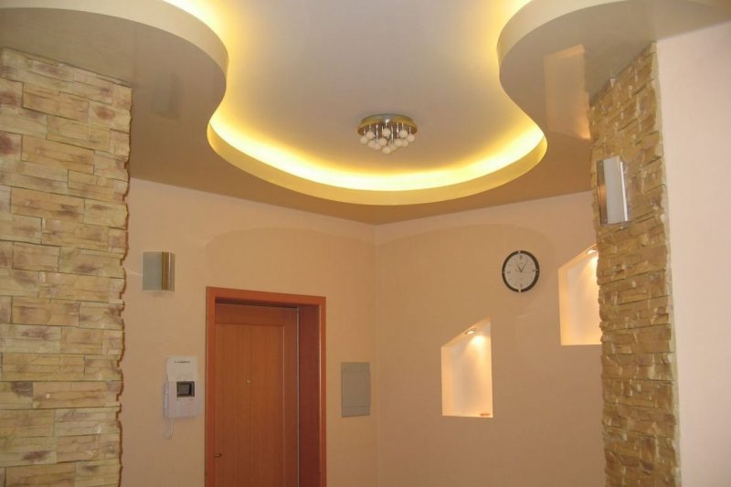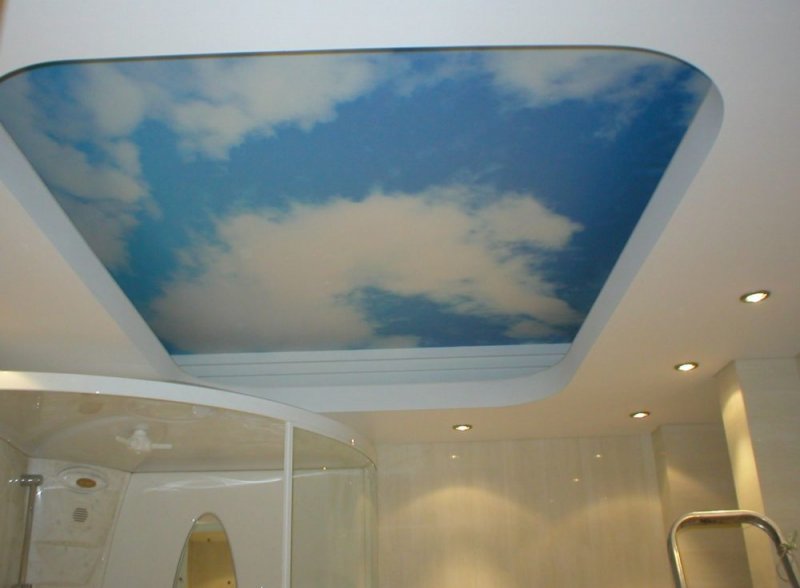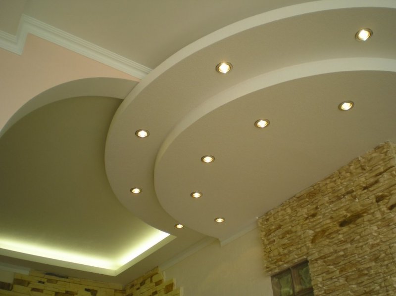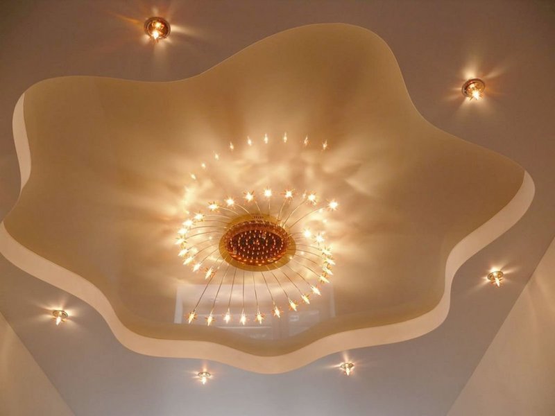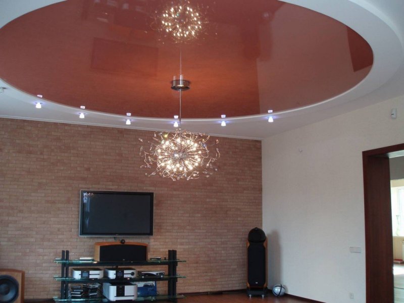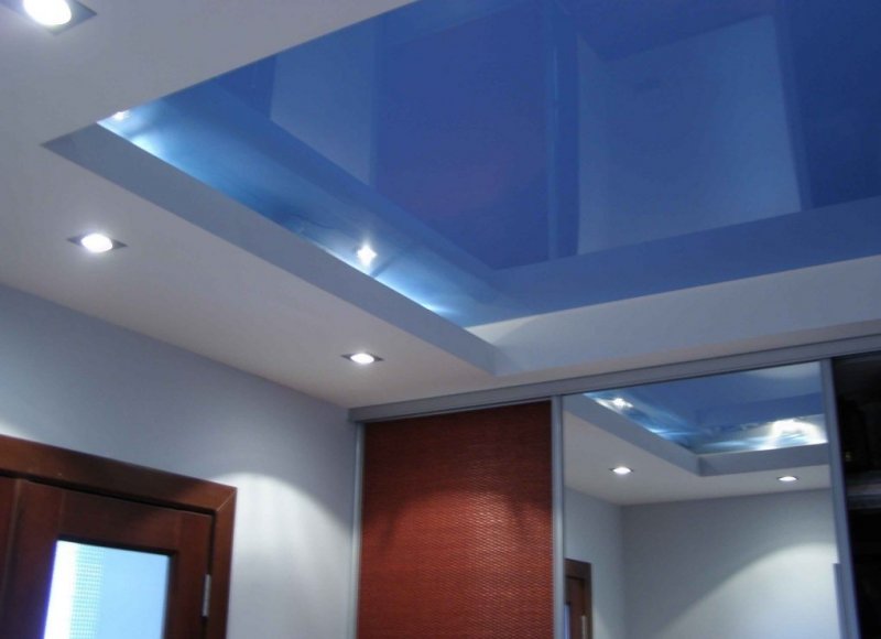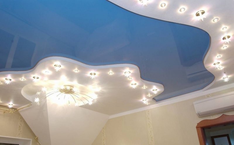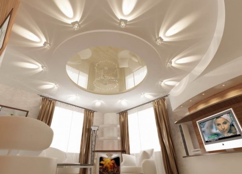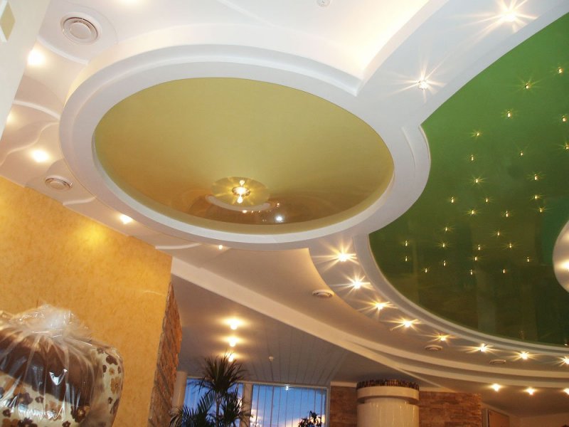 Очень интересно смотрятся комбинированные потолки. Например, сочетание натяжной конструкции с гипсокартонной навесной.