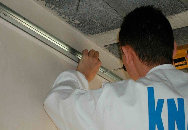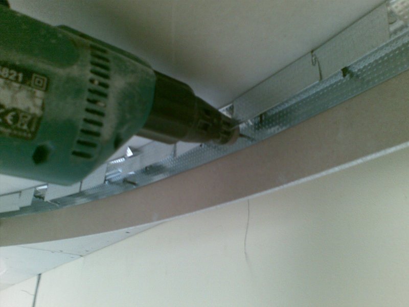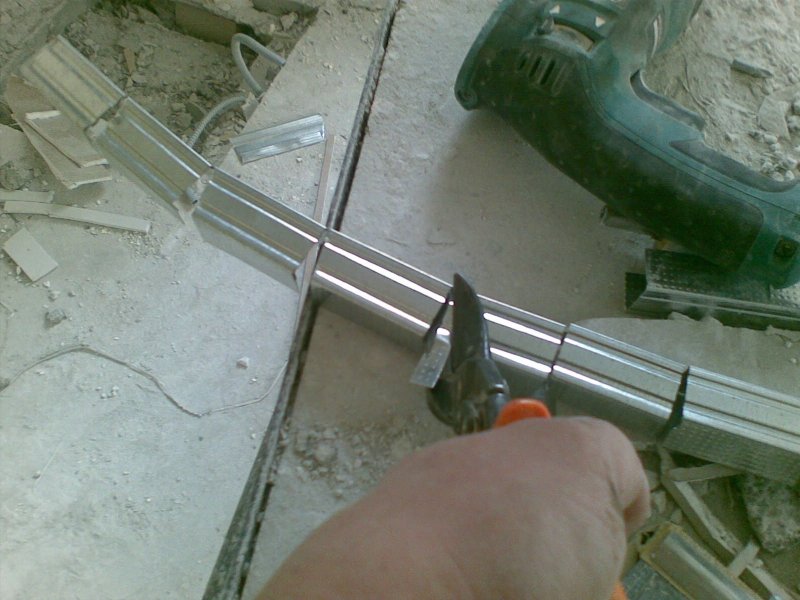 По уровню отмечаются точки в остальных углах, расположенных на той же высоте. После чего между метками натягивается уровень в виде бечевки, или проводится соединяющая все отмеченные точки линия. Далее по разметке устанавливается направляющий профиль UD. Для этого с помощью дрели сверлятся отверстия, в которые забиваются дюбеля. Стыковочные швы дополнительно укрепляются, между двумя профилями по обе стороны от стыка заводится кусок жести, фанеры.