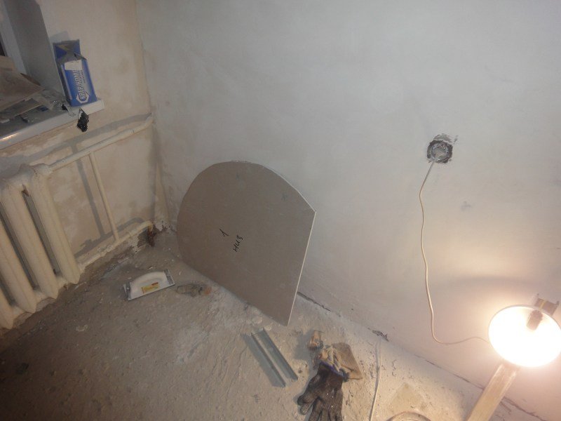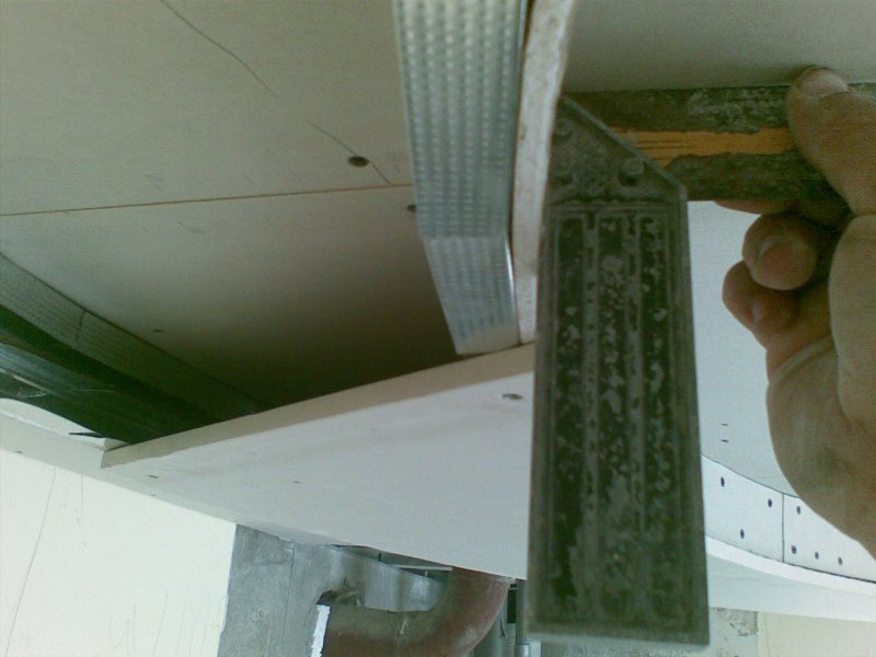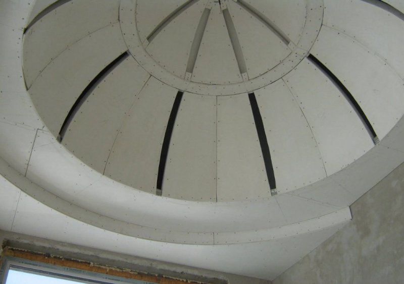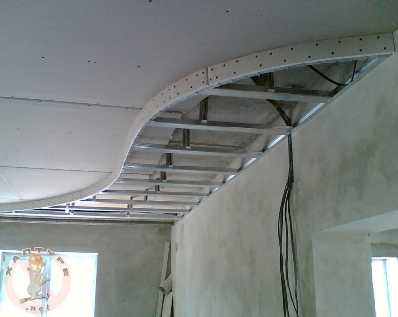 Кроме порезки и заделки швов, гипсокартонные листы можно сгибать, придавая им волнистые, изогнутые формы, например, арка, овал, круг, извилистая диагональная линия. Для сгиба листов используют сухой или мокрый метод. Вместе с листом сгибается и направляющий профиль, на котором по бокам делают надрезы с помощью ножниц по металлу.