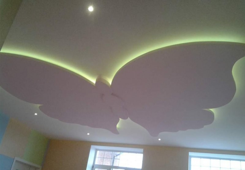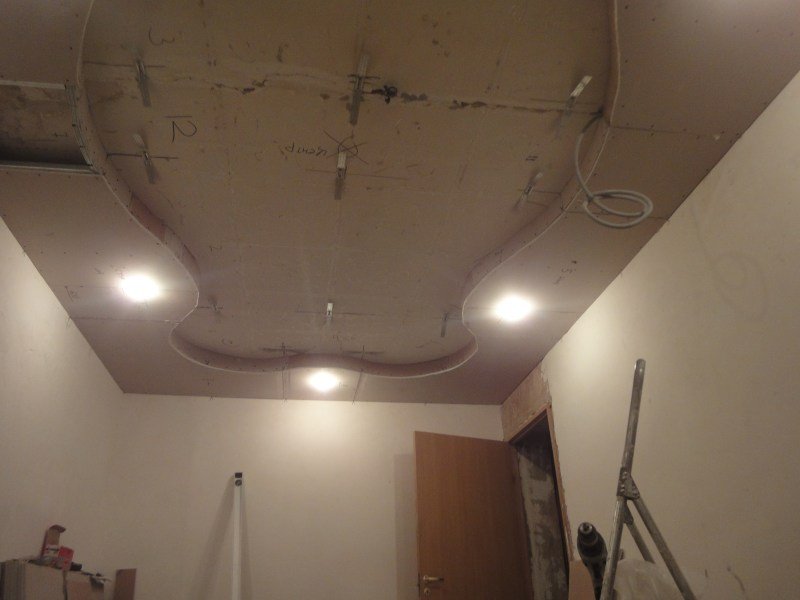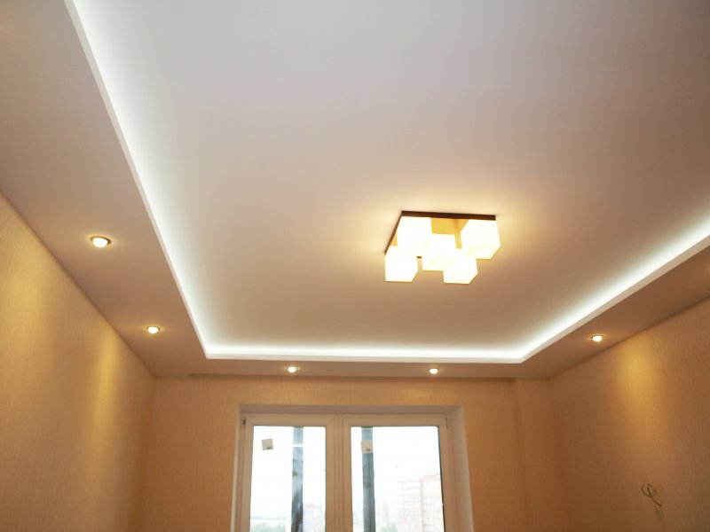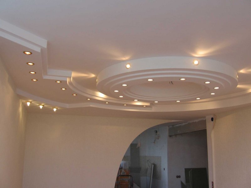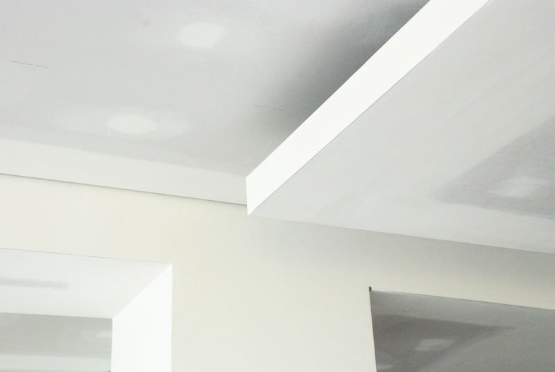 Одноуровневые. Являются готовым элементом интерьера. Могут выступать основой для многоуровневых конструкций. Монтажные работы под силу человеку с небольшим строительным опытом. Состоят из каркаса, выставленного по уровню, с закрепленными к нему гипсокартонными листами.