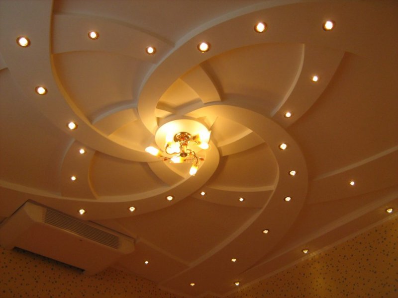 Вариантов проектирования, украшения потолочного перекрытия неограниченное количество. При этом гипсокартон позволяет сооружать многоуровневые потолки, которые при правильно подобранной отделке, в сочетании с осветительными приборами, помогут создать неповторимый интерьер помещения. Применение стройматериала допустимо практически в любой комнате, будь то гостиная, спальня или холл.