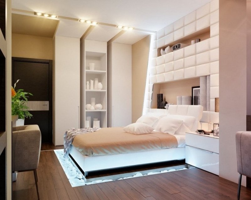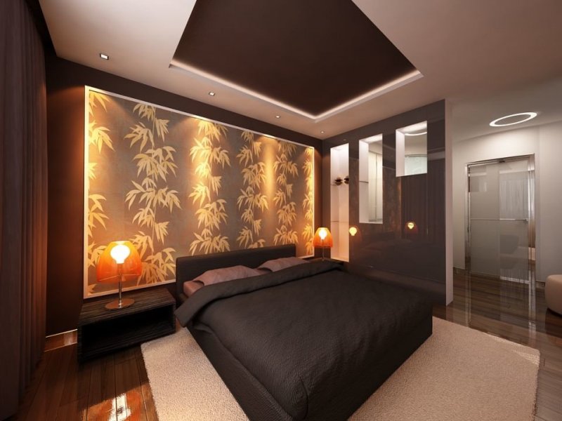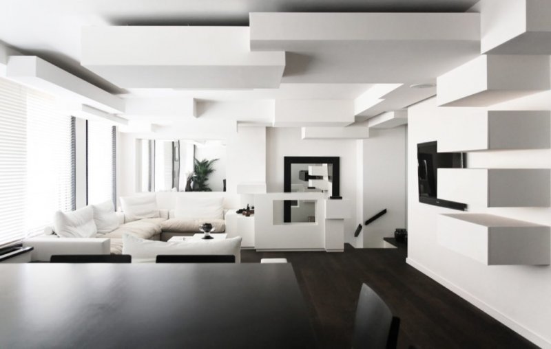 Минимализм. Подойдут одноярусные потолки, имеющие достаточно простой вид, без лишних элементов декора. В качестве освещения предпочтение следует отдать светодиодным лентам, точечным светильникам.
