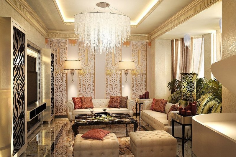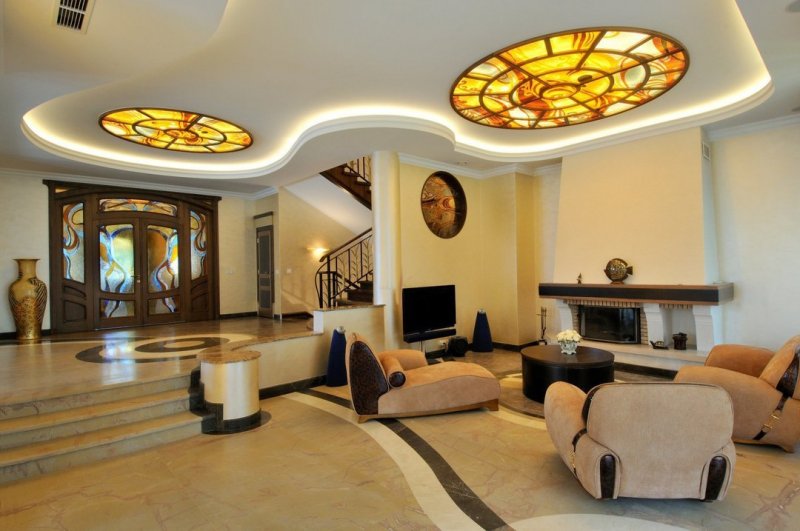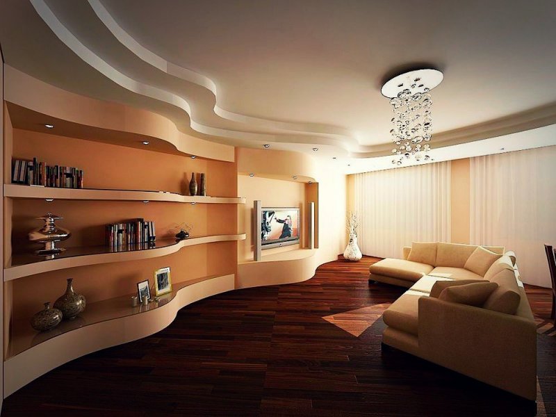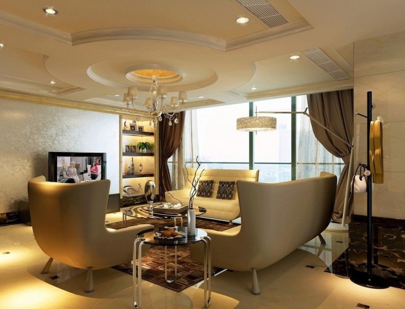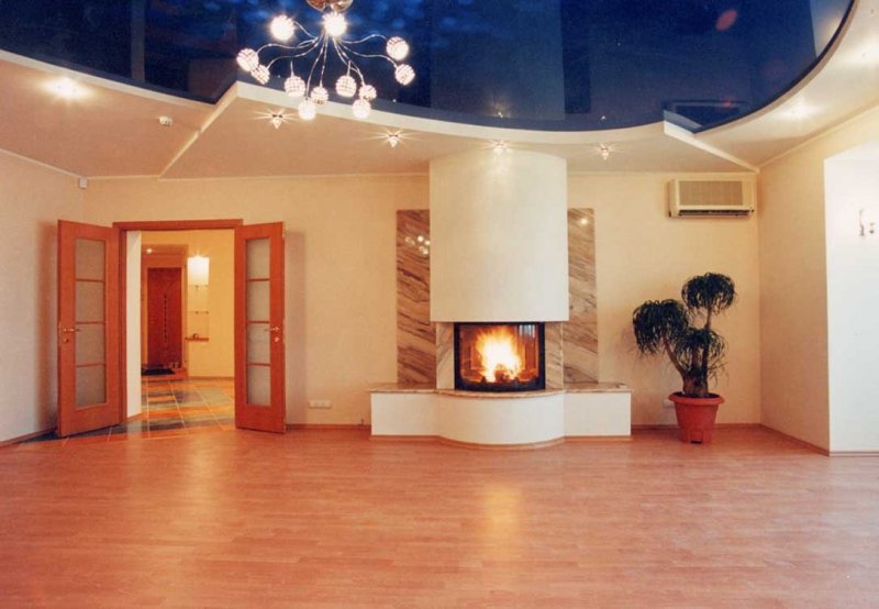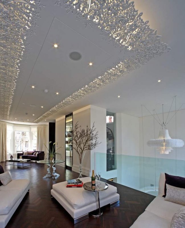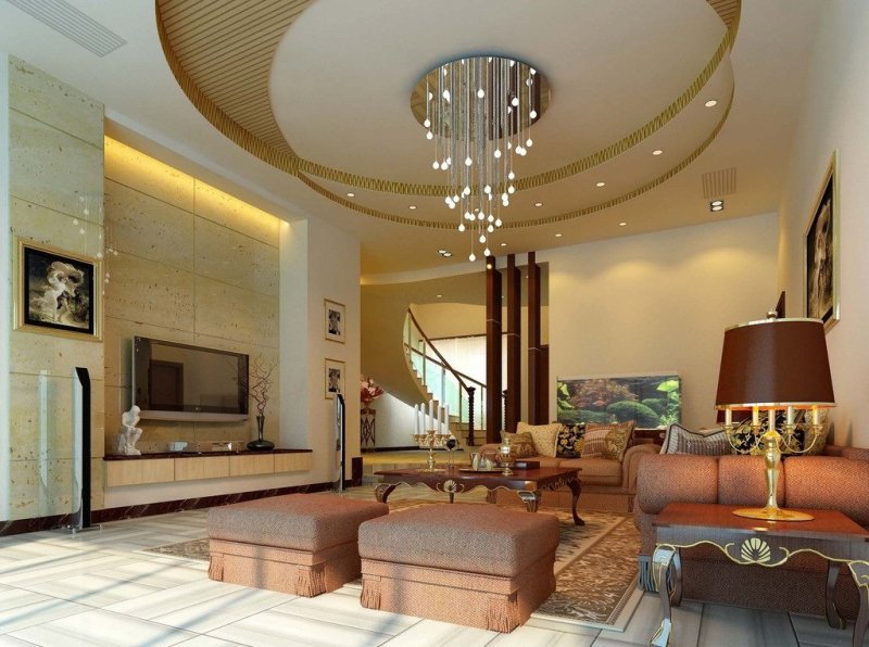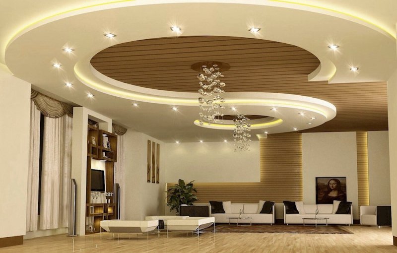Классика. Можно использовать многоуровневые конструкции, сложные арочные, фигурные потолки. В центре помещения хорошо впишется люстра.