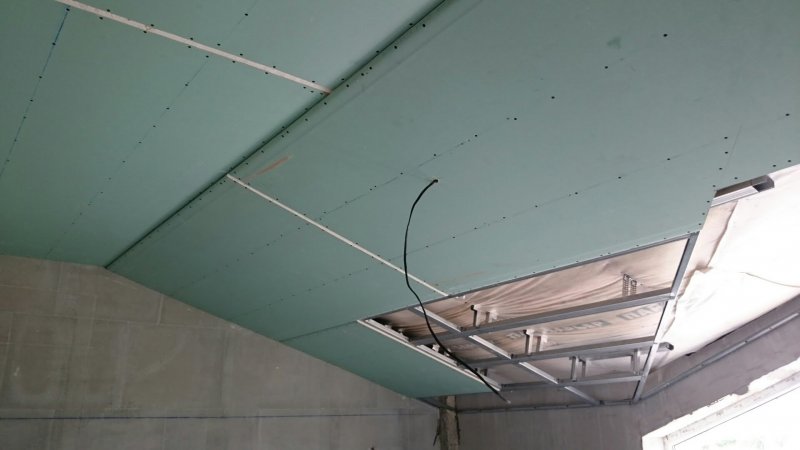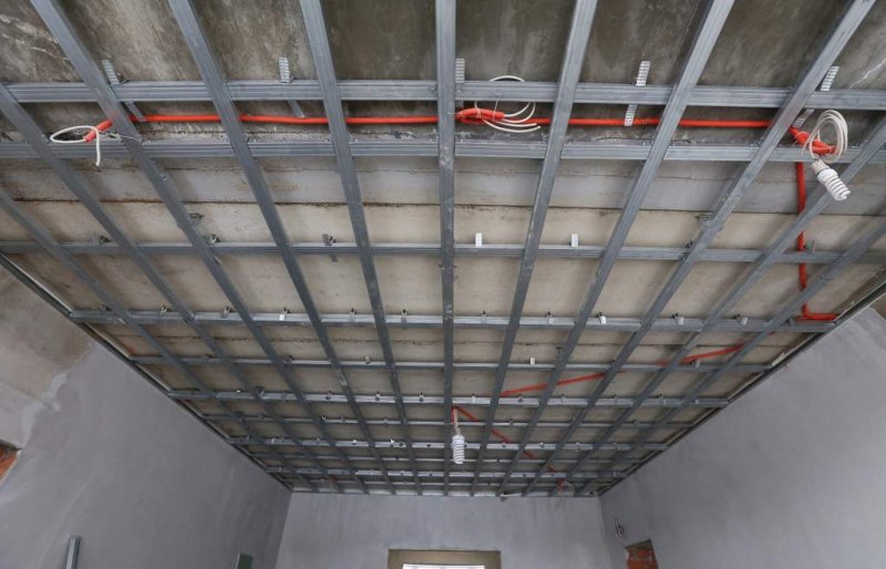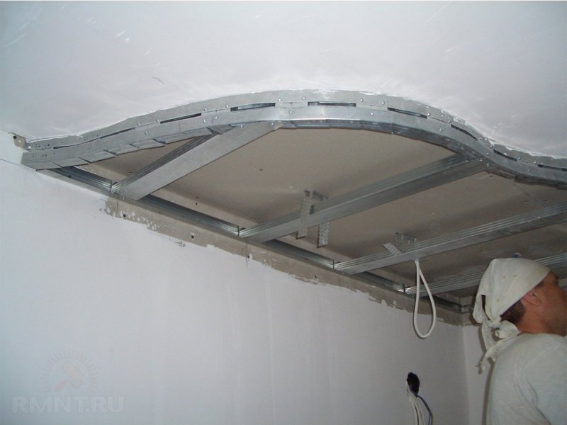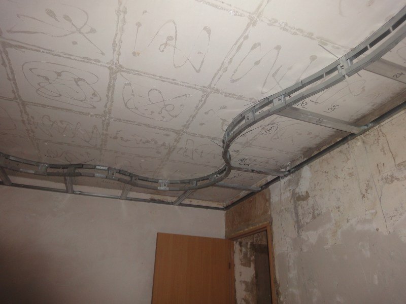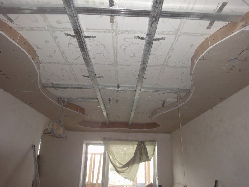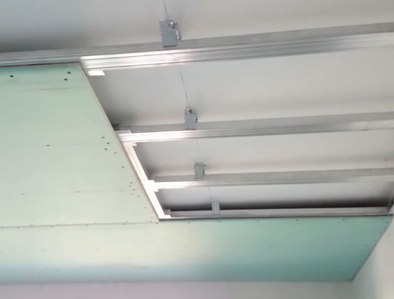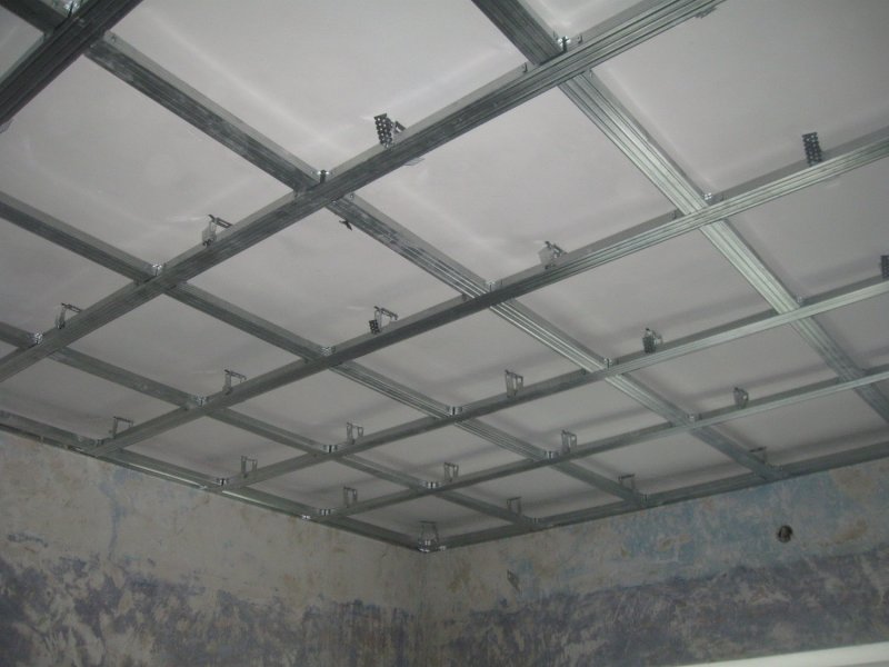 Подшивной. Каркас собирается из потолочного металлического профиля, очень редко используют деревянные рейки. Крепление обрешетки производится непосредственно к поверхности потолка, а расстояние до гипсокартона минимально, равно ширине используемого материала для каркаса.