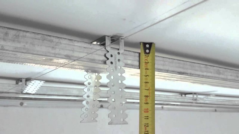 Следующим шагом станет закрепление подвесов. Их соединяют с потолком при помощи анкеров. Расстояние между подвесными крепежами делают в пределах 50-60 см. Первый устанавливают, отступая 25 см от стены. После соединения подвесов с профилем получается готовый каркас.
