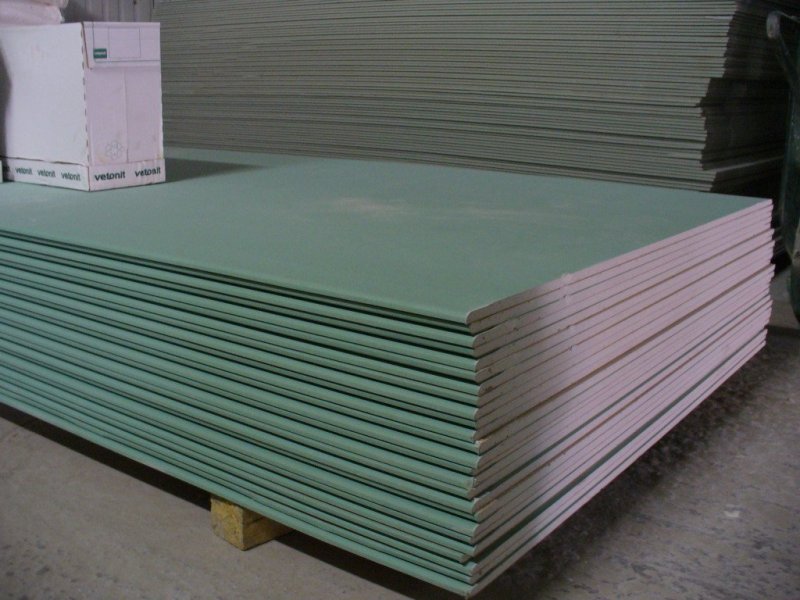 ГКЛВ (влагостойкий) – разработан для помещений с повышенной влажностью (более 60%). Устанавливают в кухнях, ванных комнатах, бассейнах. Имеет зеленую окраску. Обработан антисептиками, противогрибковыми пропитками. В сердечник добавляются силиконовые гранулы.