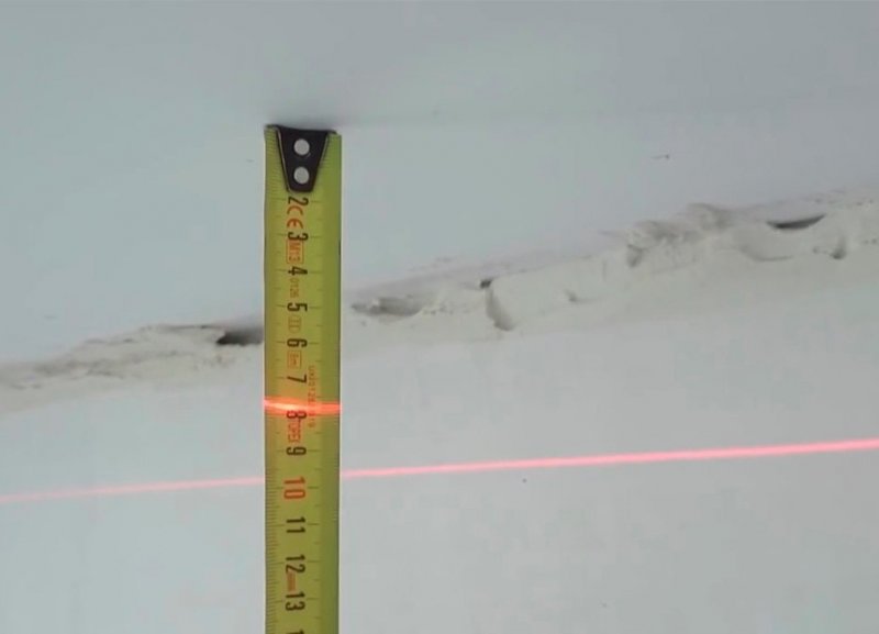Работа начинается с определения самого низкого угла в помещении. Для этого идеально подойдет лазерный уровень, если такового нет, используется обычная рулетка. В этом месте ставится первая отметка. В зависимости от наличия встроенных осветительных элементов, отступ от потолка будет составлять 5 мм при их отсутствии, 9 мм – при размещении.