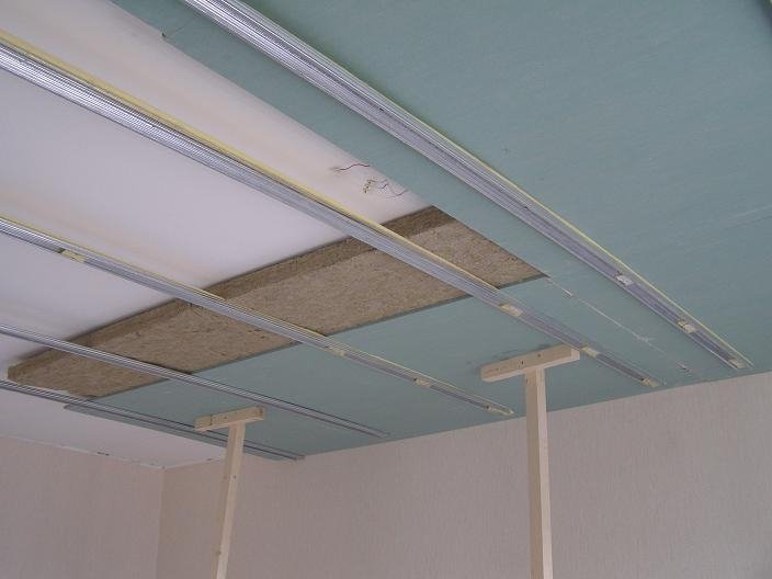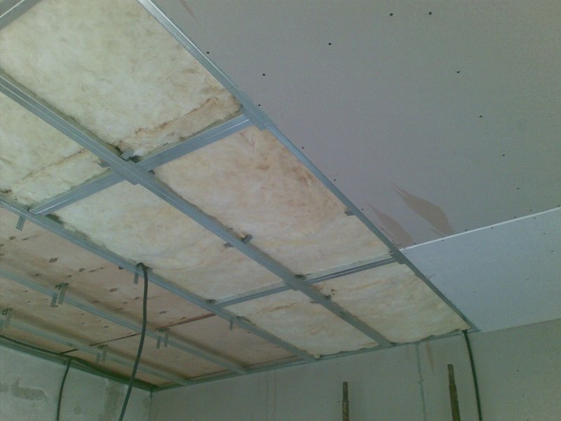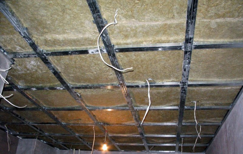 Для бетонных плит, монолитного перекрытия необходима дополнительная теплоизоляция. Чаще всего выбирается минвата, пенопласт. Утеплителем заполняются пустые участки каркаса. При этом учитывается наличие встроенных осветительных ламп. Перегрев проводки может привести к пожару.