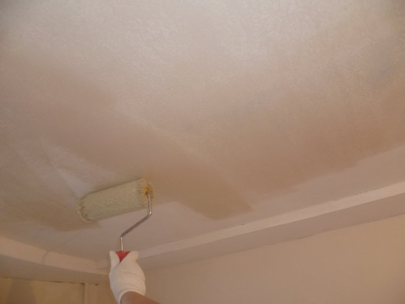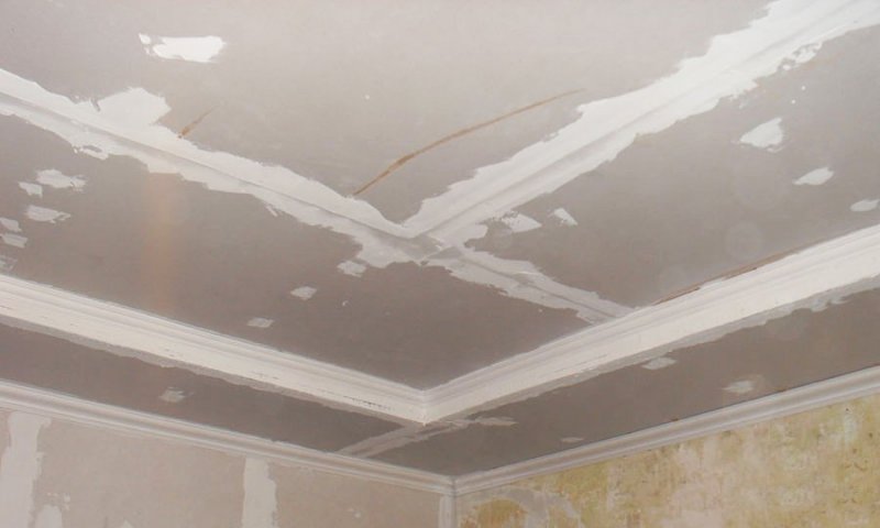 При наличии, с потолка удаляется старая отделка, поверхность очищается от пятен.