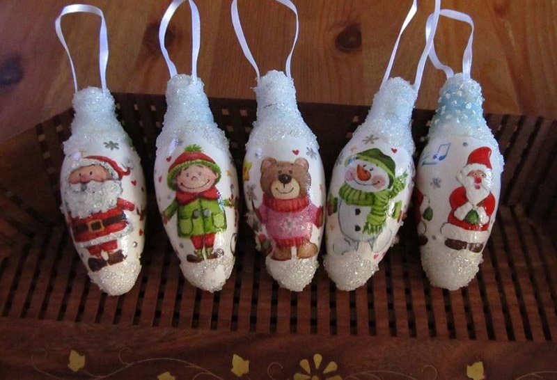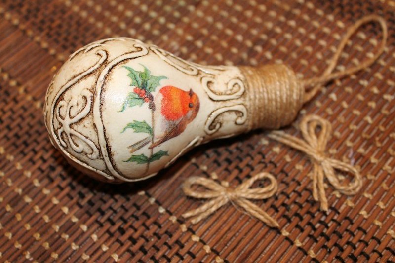 Для декора в технике декупаж потребуется специальная салфетка с картинкой, фотография на тонком листе, нотные полоски, клочки газет или прочие бумажные элементы. Сначала лампочку надо протереть спиртом и покрасить в любой понравившийся цвет. После полного высыхания заготовки вырезаем рисунки из салфетки и приклеиваем к лампочке. Края надо хорошо расправить и придавить сухим полотенцем. Придать блеск, и обезопасить покрытие от внешних факторов можно при помощи тонкого слоя бесцветного лака.