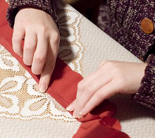 Подготовленные тканевые прямоугольники необходимо ровно приложить к долькам и спрятать их края в пазы. Проталкивать материал можно любым плоским предметом. После оформления всех секторов можно переходить к декорированию. Швы прячем под лентой или тесьмой, обматывая материалом шарик по диагонали. Из остатков шнура формируем петельку.