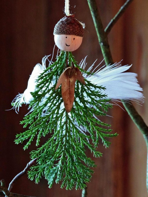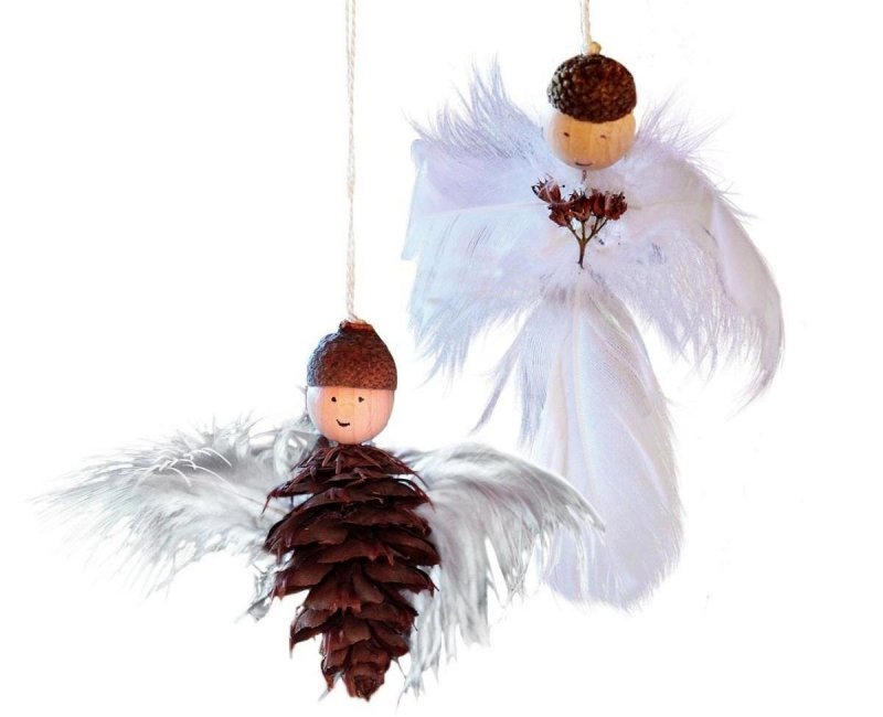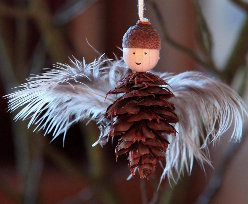 Для поделки потребуются красивые ровные шишки, лента, кусочки фетра и деревянные, пластиковые шарики. Чтобы натуральная основа не потеряла форму из-за смены температуры, шишку можно опустить на несколько секунд в емкость со столярным клеем. После высыхания она не потеряет форму и всегда будет закрытой. Следующий мастер-класс поможет создать простые фигурки ангелочков: