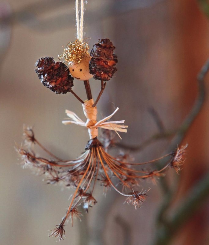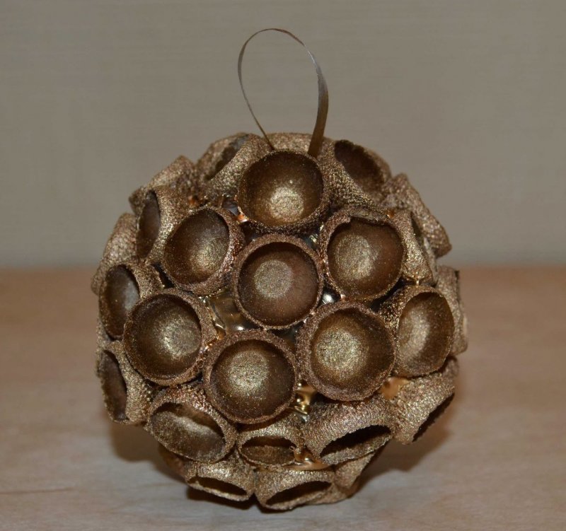 Подготовленное ядро красим в коричневый цвет и приклеиваем шляпки хвостиками к шару. Заполнять пространство необходимо как можно плотнее. Место одного впалого элемента займет крючок крепление из проволоки. Декорировать игрушку можно при помощи силикатного клея и блесток, красивых бусин внутри шляпок, ленточек.