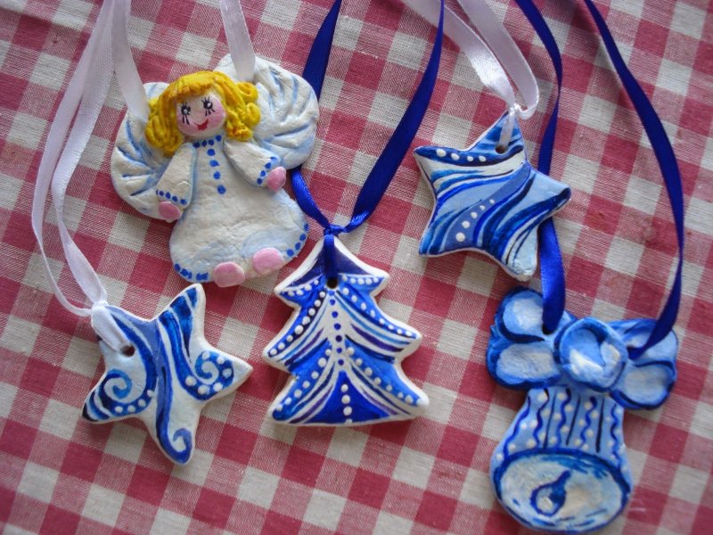 После полного высыхания новогодние поделки декорируют любыми элементами (лентами, пуговицами, бисером, стразами). Если сделать отверстия по центру игрушек, можно создать яркую, оригинальную гирлянду.