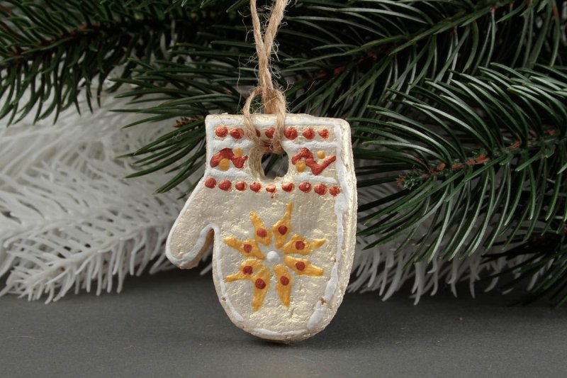 Ингредиентами для основы служат мука, соль и вода. Елочные игрушки из природных компонентов очень просто изготовить, они могут долго храниться. Создавать фигурки можно при помощи форм для печенья или просто вырезать ножом по эскизу. Красивый рельефный узор получается при отпечатке различных листиков, веточек, монеток. Для декора оригинальных подвесных игрушек подойдут краски, бусины, стразы, присыпки.