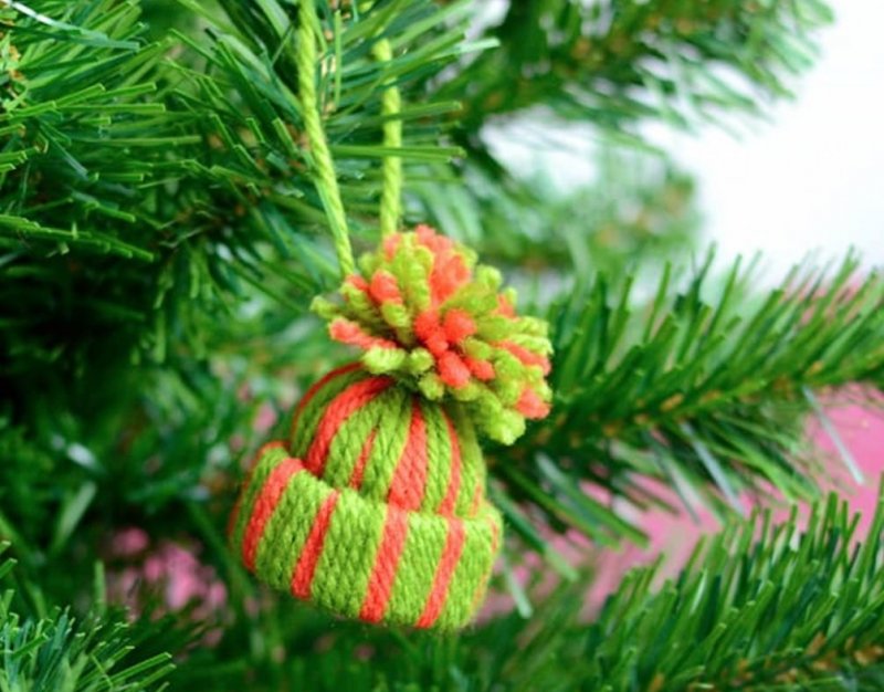Такие елочные игрушки получаются по-настоящему домашними. Их можно делать плоскими или объемными. Красиво смотрятся плоские изделия на основе кольца. Для этого подойдет отрезанный край пластикового стаканчика и любая плотная пряжа. При желании в центр можно поместить любую новогоднюю картинку. Если есть опыт вязания крючком, основу можно не использовать. Чтобы вещь держала форму, ее просто надо накрахмалить.