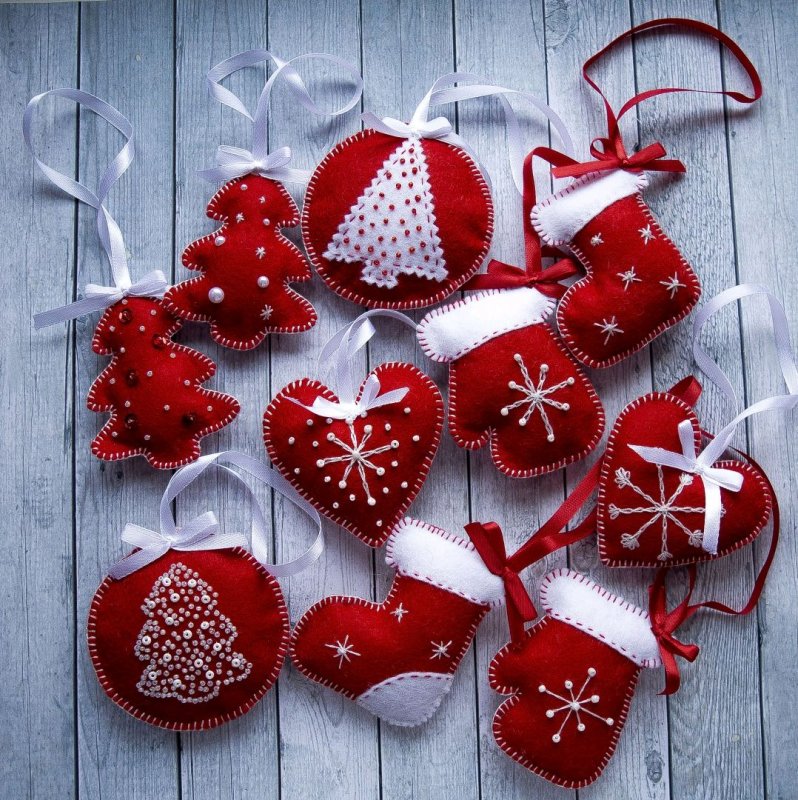 Самые простые елочные игрушки – плоские. Это обычные вырезанные фигурки, задекорированные с одной или двух сторон. С помощью маркера переносят шаблон на фетр, вырезают. Можно сделать красивую елочку, мордочку любого животного, например, свинки. Обратную сторону для прочности укрепляют картоном.