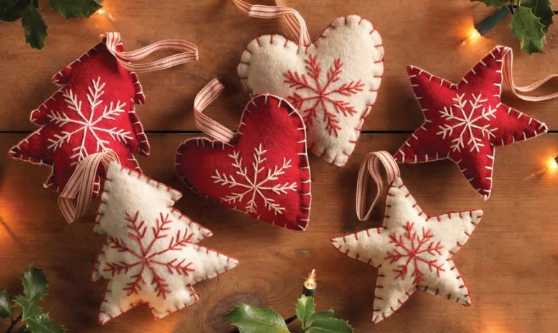 Если нужна объемная елочная игрушка, то по шаблону вырезают сразу две заготовки. Затем кусочки целого декорируют и соединяют нитками. Используют несколько следующих швов: