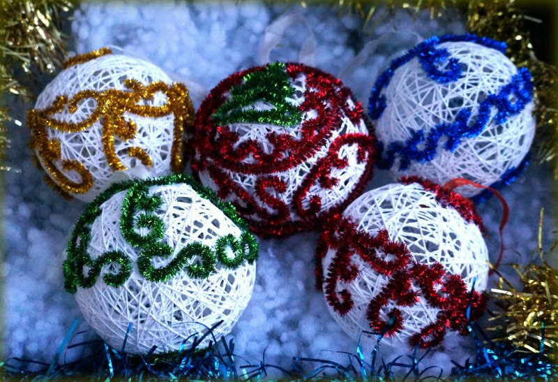 Из обычных шерстяных ниток можно создать круглые сетчатые игрушки для новогодней елки. Для работы понадобятся небольшие воздушные шарики, нитки и клей ПВА. Надуваем шарик подходящего размера и завязываем его хвостик концом нитки. Начиная с этого же края, обматываем форму плотно и в произвольном порядке. Нитки пряжи не должны близко располагаться друг к другу.