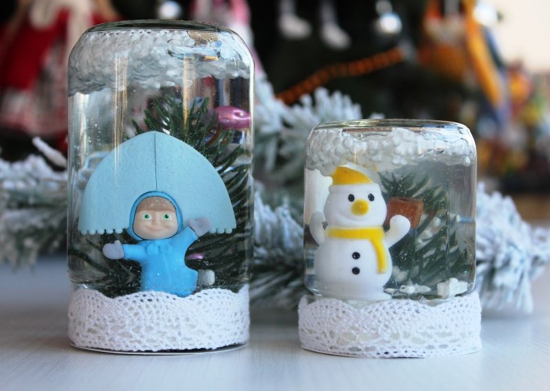 Традиционный рождественский подарок европейцев можно сделать своими руками. Собранный по частям снежный шар из подручных материалов подарит радость, веру в чудо взрослым и детям. Основой игрушки может стать любая баночка с плотно закручивающейся крышкой. Для наполнителя потребуется простая вода и несколько капель глицерина.