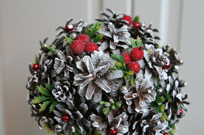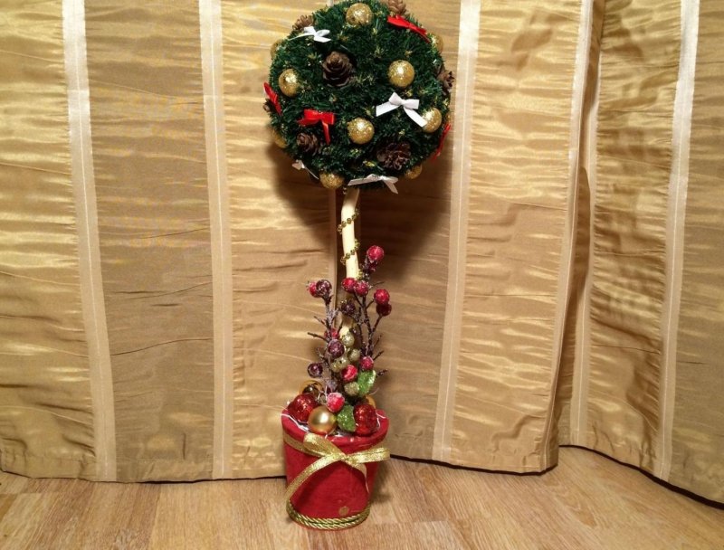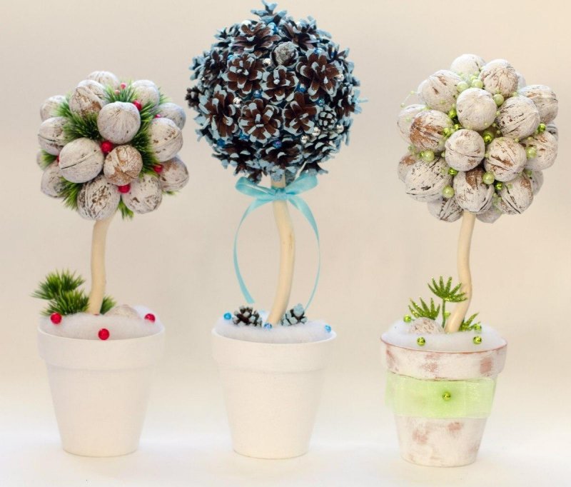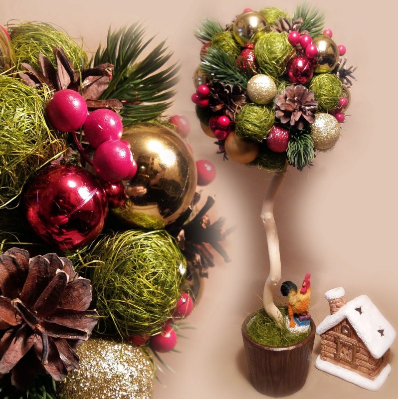 Новогодний топиарий можно сделать из любых материалов, которые так или иначе задействованы в праздничных приготовлениях. В ход могут пойти любые элементы мелкого декора, которыми обычно украшают комнату и акцентные зоны у камина, возле елочки, на дверях. Крону украшают миниатюрными подарками, обернутыми в яркую пленку, цветами из дождика и пушистой мишуры, фигурками зверей, колокольчиками с золотым и серебряным напылением, ярко-красными бутонами, которые так органично контрастируют с блестками, ниточками бус и атласными бантиками. Материалы можно органично комбинировать друг с другом. К примеру, великолепно будет смотреться топиарий, изготовленный из натуральных деталей (шишки, желуди, орешки) и искусственного елочного декора (шарики, колокольчики, флористическая листва). Их можно разделить условной полосой, проведенной ровно посередине кроны, или причудливо вмешать, получив необычное попурри. Чтобы подчеркнуть праздничность композиции, желательно воткнуть в основу шара или в горшочек возле ствола пару настоящих еловых веточек. О том, как их покрыть искусственным снегом, уже говорилось выше. Хотя можно купить и готовый состав, который продается в баллончиках и распыляется на поверхности.