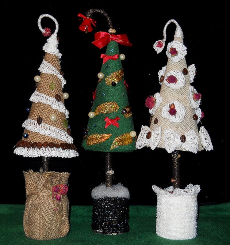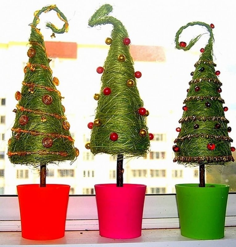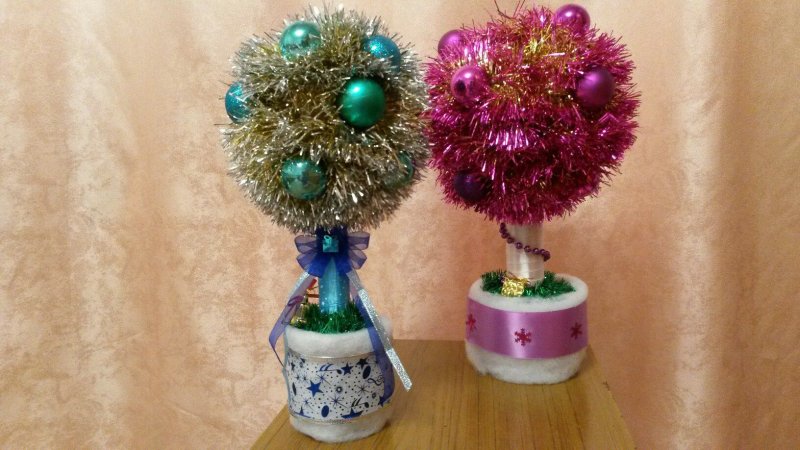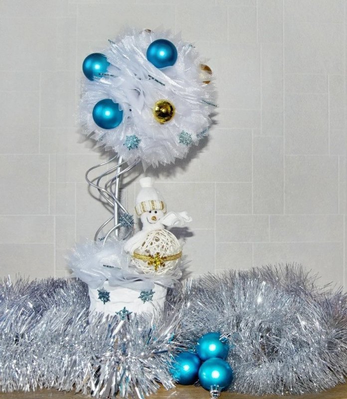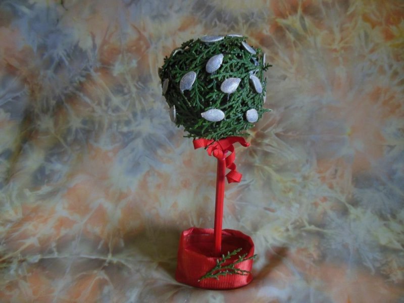 При изготовлении новогодних топиариев часто отступают от классических стандартов и поделкам придают традиционную форму елочки.