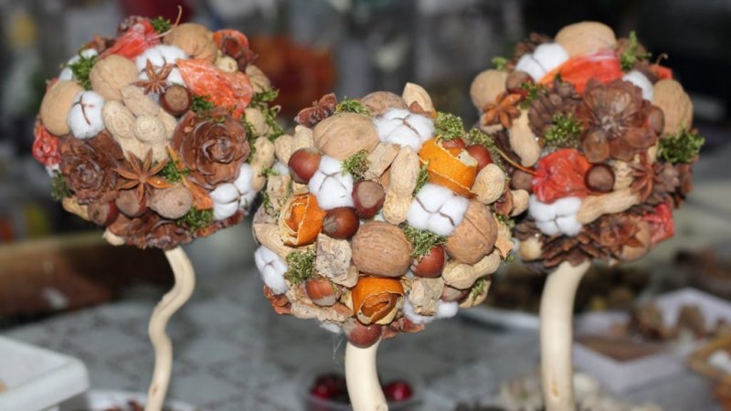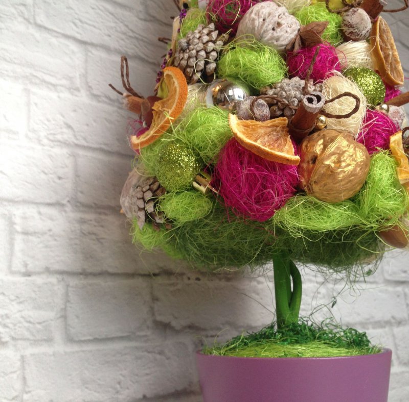 Топиарий из природных материалов — отличное дополнение интерьера, оформленного по принципам эко стиля. Для работы используют шишки, желуди, кофейные зерна и тыквенные семечки, маленькие веточки, сухие листья, коробочки физалиса, фундук, грецкие орехи, каштаны, кусочки мха, мандариновые шкурки и скорлупу от фисташек. Наиболее интересно применение двух последних элементов декора. Свежую кожуру от мандаринов или апельсинов нарезают на полоски, которые скручивают спиралью и закрепляют в таком виде, чтобы они не разворачивались. Деталь топиария должна высохнуть. Как известно, кожура спустя два-три дня отвердевает и «спиралька» будет отлично держать форму. С одной стороны ее накалывают на проволоку, после чего закрепляют на пенопластовой основе. Скорлупа от фисташек используется для создания оригинальных «распустившихся бутонов». Половинки склеивают друг с другом у оснований таким образом, чтобы получилась имитация лепестков-чашечек.