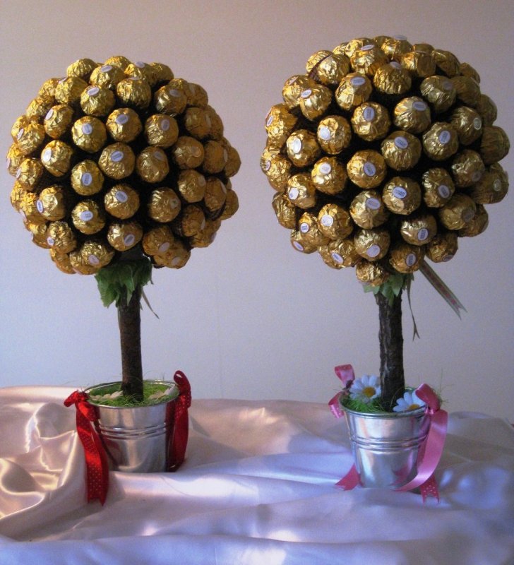 Для топиария лучше выбирать конфеты круглой или конусовидной формы. В композиции они будут смотреться органично. Крону из сладостей дополняют свежими фруктами (яблоки, мандарины, лимоны), если нужно сделать акцент на натуральности. В более нежных, романтичных композициях конфеты декорируют таким образом, что они становятся сердцевинами цветочных бутонов. Для изготовления лепестков используют креп-бумагу, фольгу, ткань. Закрепляют сладости, как правило, на шпажках. Для композиции лучше использовать основу из пенопласта.