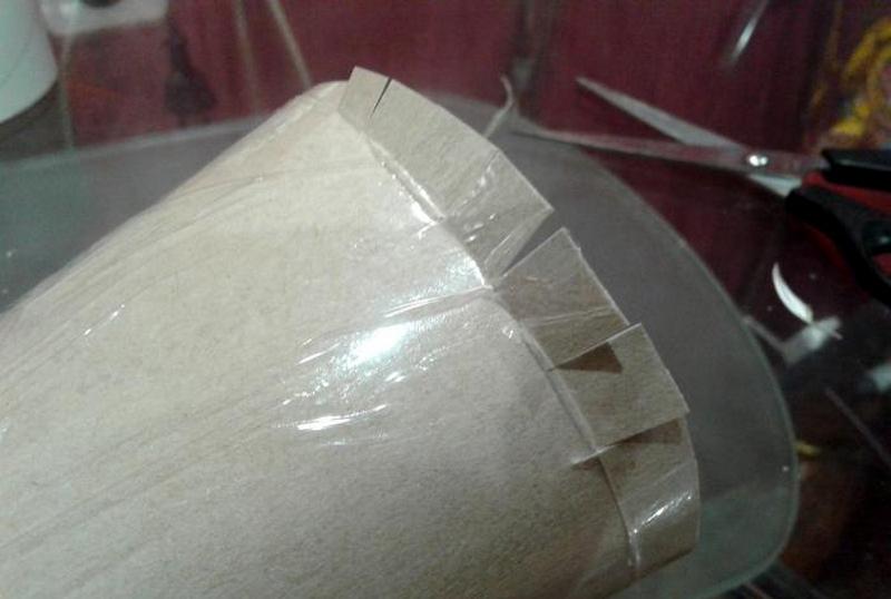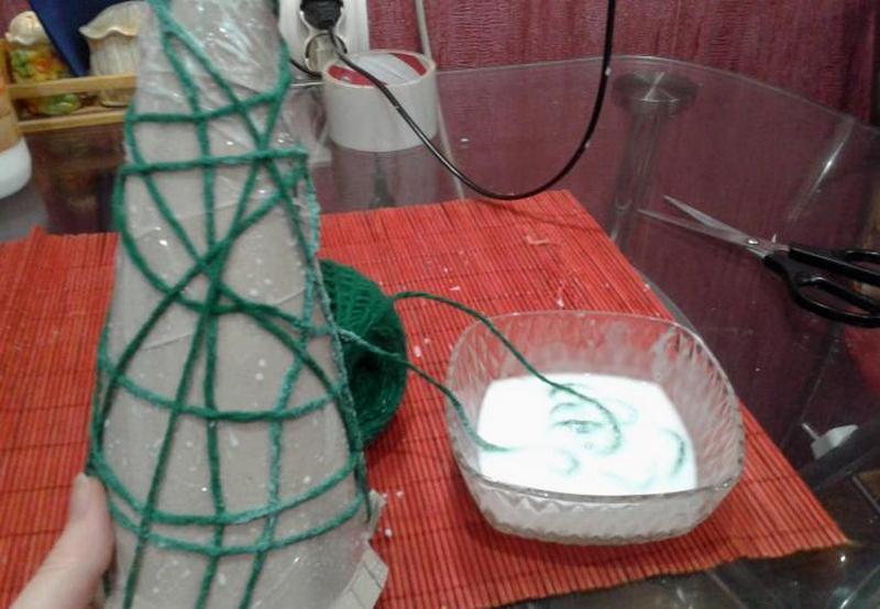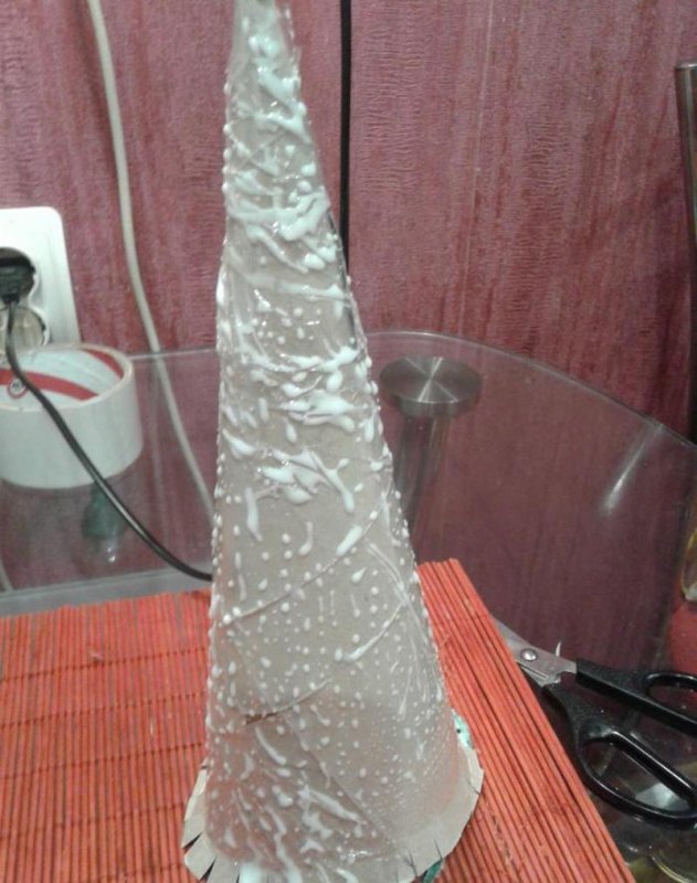 Основу в форме упрощенной елочки изготавливают из тех же материалов, что и для шарообразной кроны. Такую конфигурацию сделать сложнее, так как оригинальное деревце состоит из нескольких усеченных и одного полноценного конуса на верхушке, которые водружены друг на друга. Найти какой-либо предмет или емкость, совпадающий по форме, практически невозможно. Начинающим лучше прибегнуть к лаконичным идеям минимализма и использовать один конус, который и будет символизировать новогоднюю елку. Форму легко сделать из обычного картона, который впоследствии оборачивают слоями бумаги, смоченной в клеевом составе. Также для такой поделки подойдут праздничные колпаки, которые обычно надевают на головы гости именинника.