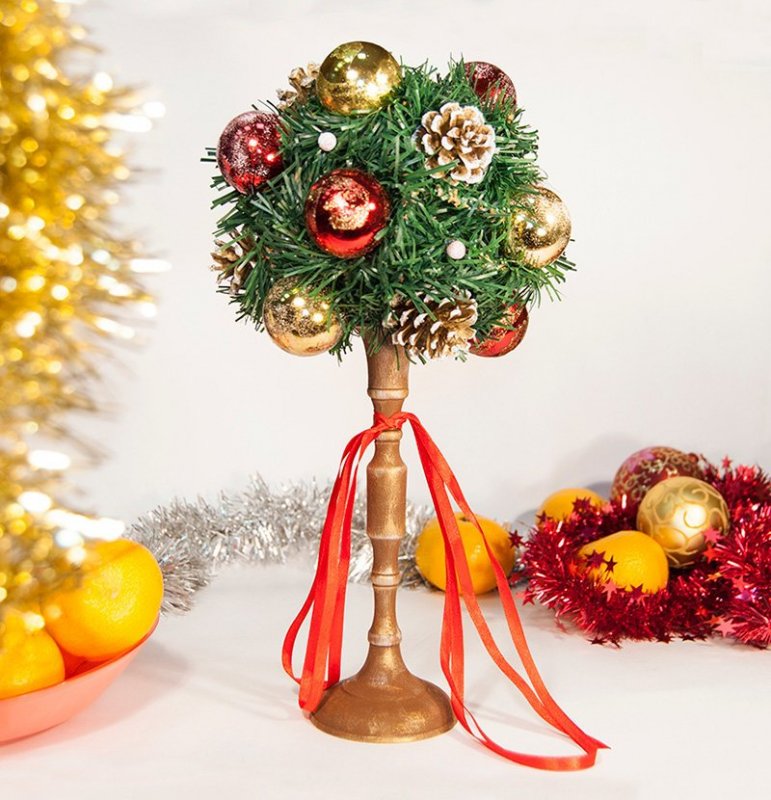Топиарий отлично подойдет для тесных квартир, где просто нет места даже для небольшой настоящей или искусственной елочки. Красиво будет смотреться композиция в горшке на окне, в центре праздничного стола или на каминной полке. Этот же вариант подойдет для новогоднего оформления офиса. Можно изготовить небольшое деревце размером с кактус и поставить на рабочий стол. Всего один штрих подарит ощущение предвкушения праздника и будни будут казаться не такими серыми и монотонными, как обычно. Топиарий из конфет или мандарин — замечательный подарок на Новый год, особенно для сладкоежек. Если использовать основу в форме кольца, то по такой же технологии можно изготовить праздничный венок на дверь. Эта западная традиция украшения входа все больше распространяется в нашей стране. Материалы используют такие же: мишуру, шишки, еловые веточки, красные атласные бантики, нитки с золотистыми бусинами.