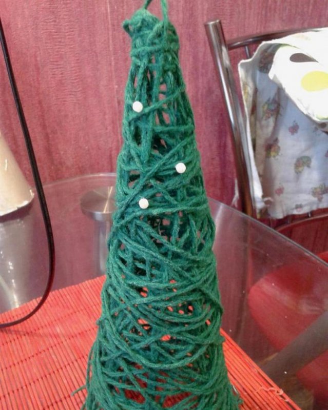 Сначала нужно изготовить основу в форме конуса из картонного листа. Затем ее начинают густо смазывать клеем ПВА и приклеивать пряжу ровными рядами, начиная с верхушки елочки. Нитки плотно пригоняют друг к другу, чтобы не оставалось просветов. Обрабатывать нужно последовательно по одному участку. Можно использовать сочетание пряжи разных оттенков. Когда клей схватится и нитки закрепятся на основе, деревце начинают декорировать. Для этого используют крошечные клубочки из пряжи другого цвета, крупные бусины, яркие бантики, пуговицы, миниатюрных керамических ангелочков, мишуру, помпоны и фигурки из фетра. Из этого же материала легко вырезать небольшую верхушку-звезду. Можно сделать креативную елочку и после приклеивания пряжи отделить ее от основы. Получится полупрозрачное деревце, которое подсвечивают гирляндой изнутри.