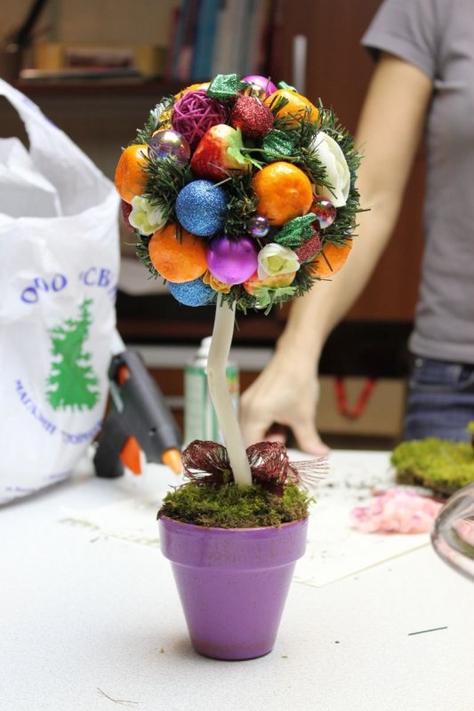 Что касается самого декора, то его список слишком обширен. Для новогоднего топиария больше подходят елочные шарики, цветы из полимерной глины, небольшие веточки ели или сосны, шишки, мишура, колокольчики, конфеты.