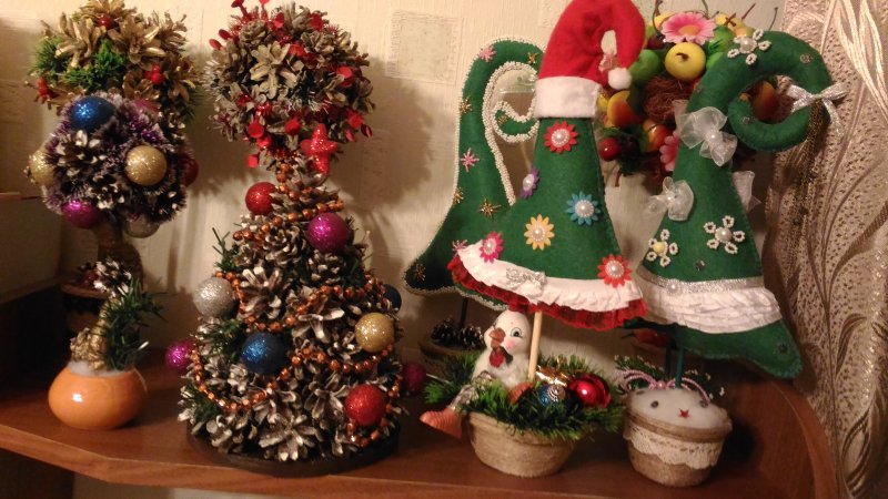 Декоративные деревья на Новый год можно изготавливать из любых подручных материалов. В ход пойдут обрезки ткани, куски бумаги, старая мишура, конфеты, настоящие фрукты, елочные игрушки, желуди, шишки, креп-бумага, атласные ленточки, цветы из полимерной глины или фоамирана. Перечень материалов можно продолжать до бесконечности. Рассмотрим несколько наиболее популярных мастер-классов.