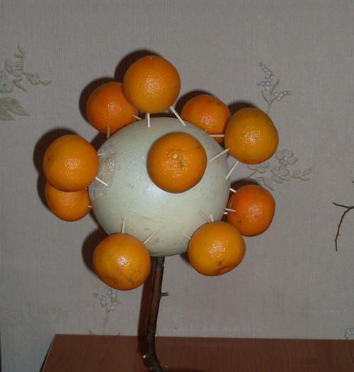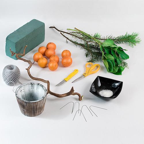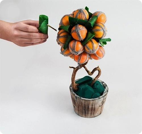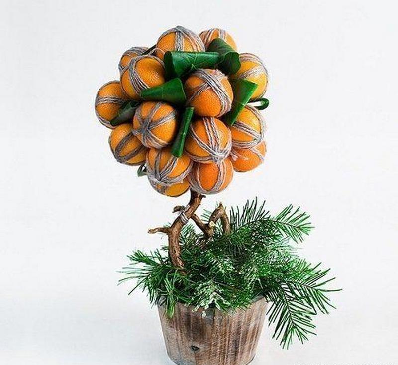 В качестве основы можно использовать и пенопласт, но мандарины довольно тяжелые, поэтому не каждый шарик выдержит такую нагрузку, а флористическая губка с этой задачей справится. Сначала из пиафлора вырезают шар или конус, в зависимости от формы будущего дерева. Затем каждую мандаринку оборачивают серой пряжей. Это необходимо для того, чтобы замаскировать проволоку, на которой детали топиария будут держаться. Проволочные отрезки тоже оборачивают вокруг мандаринок по схеме крест-накрест. Хвостики скручивают в один толстый кончик, которые в дальнейшем продевается в основу из пиафлора. Промежутки между мандаринами декорируют веточками. Их смачивают в канцелярском клее и присыпают крупными крупинками соли или сахара, чтобы создать имитацию снега. В горшок помещают второй кусок пиафлора, подогнанный по форме. В него вставляют сухую ветку, которая выполнит роль ствола.