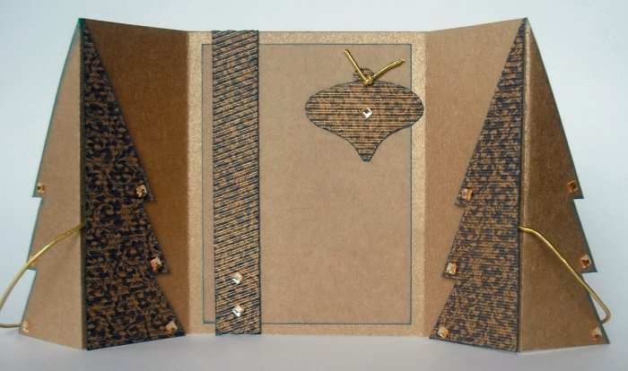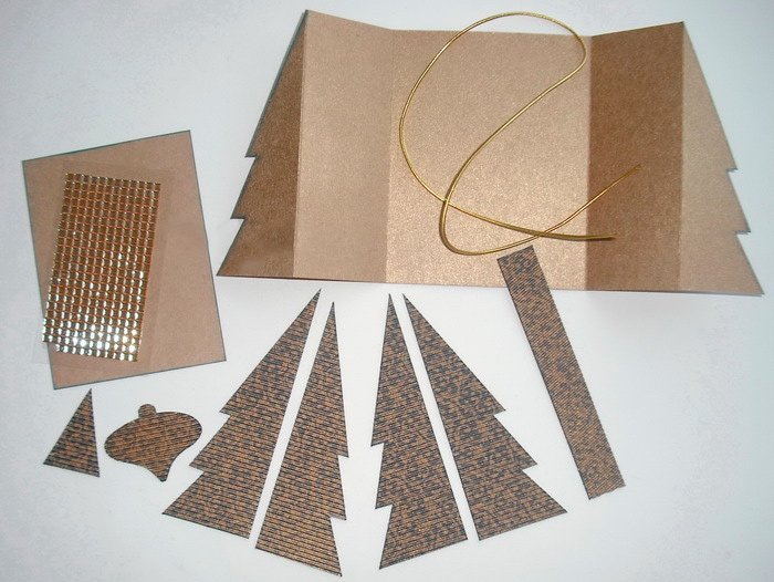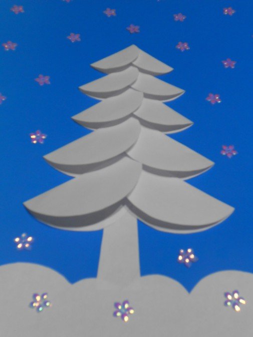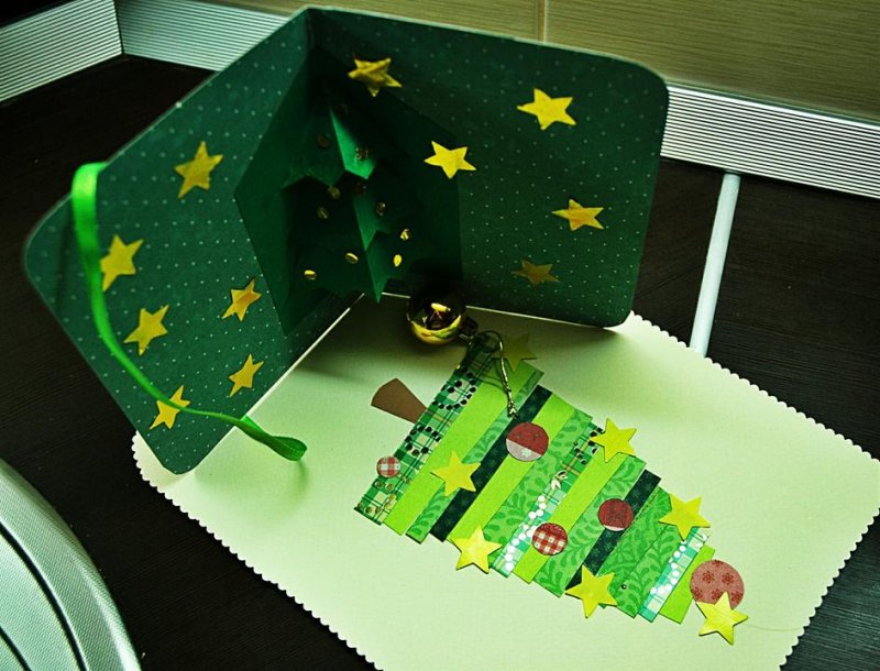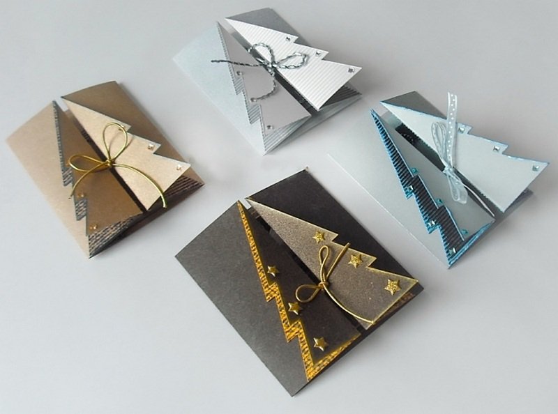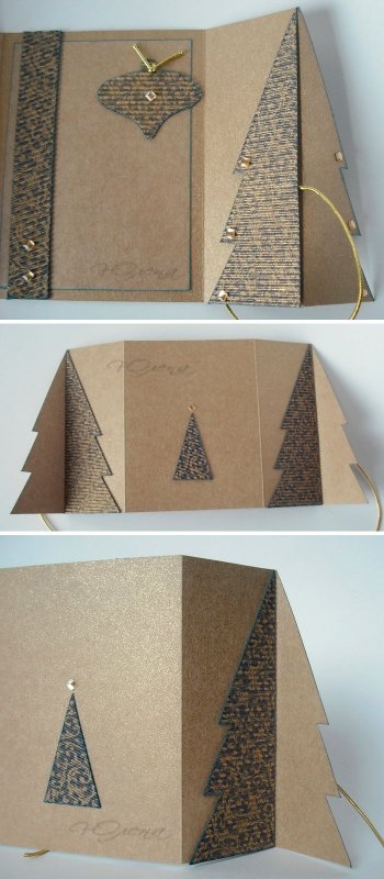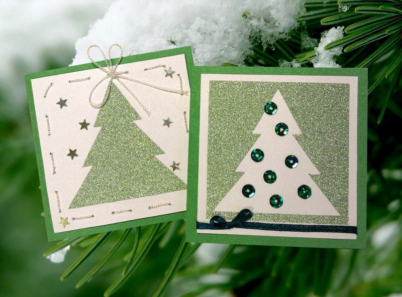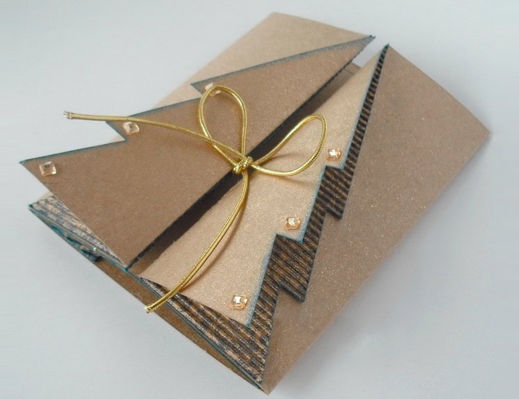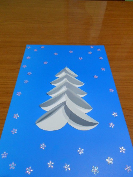После высыхания заготовки промазать клеем боковые половинки елочек и приклеить готовую фигурку к открытке. По желанию можно украсить ее стразами.