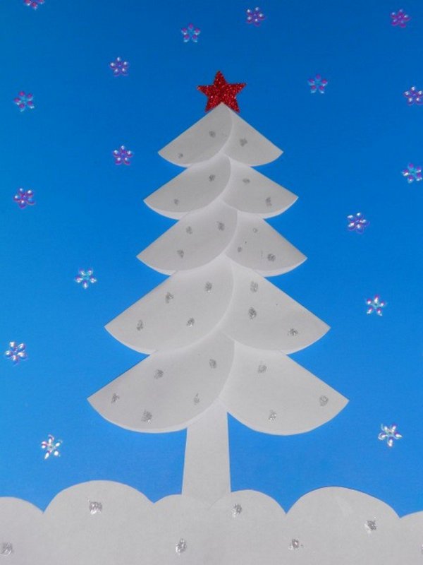 Из разноцветной бумаги в технике аппликации можно сделать очень красивую новогоднюю елочку. Для работы рекомендуется использовать 3-4 листа дизайнерской бумаги (с узорами, точками) или же 5-6 листов обычной цветной бумаги. Для изготовления поделки дополнительно потребуется клей ПВА, белый картон. Работа проводится следующим образом: