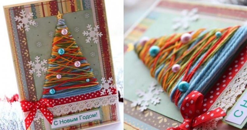С помощью картона и разноцветных ниток можно сделать стильную и интересную открытку к празднику Нового года буквально за 1 час. Правда, такая работа больше подойдет подросткам и взрослым, нежели малышам. Поэтапно изготовить оригинальные поделки вам помогут следующие краткие мастер-классы: