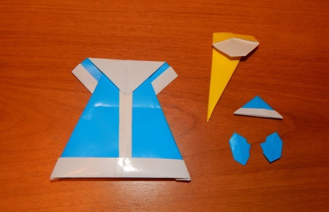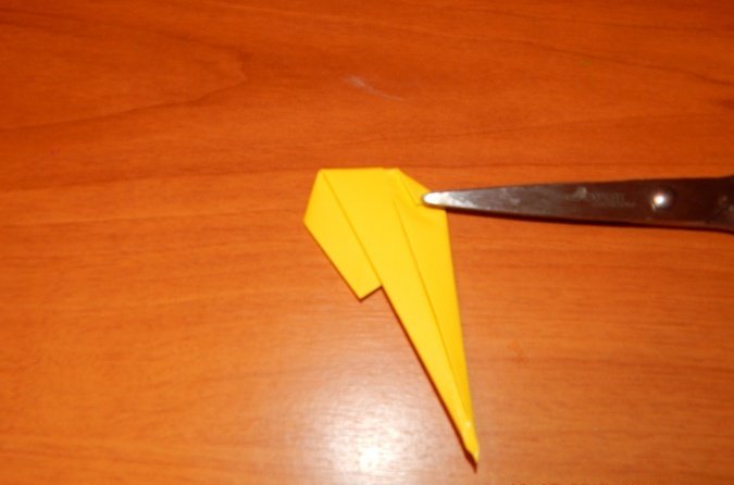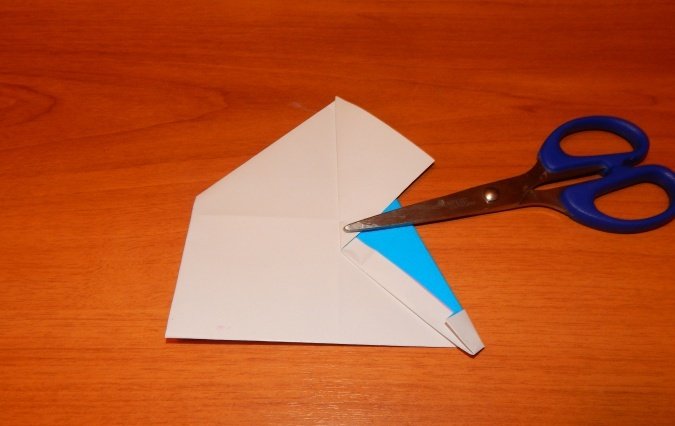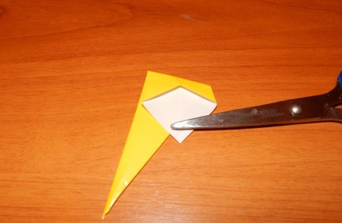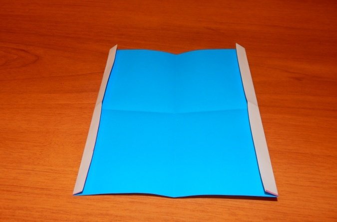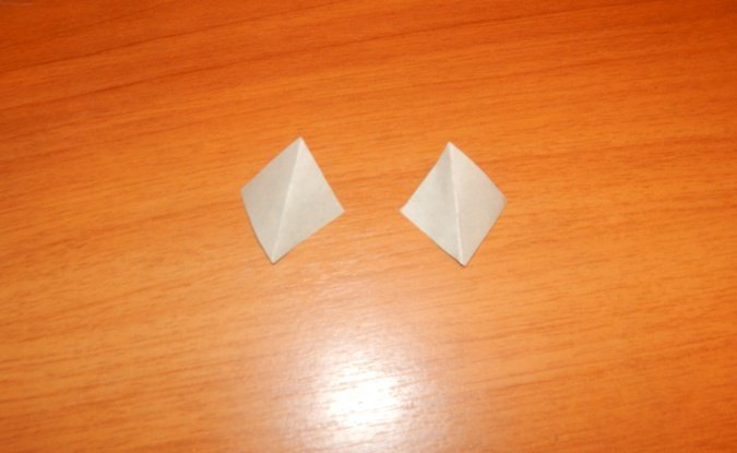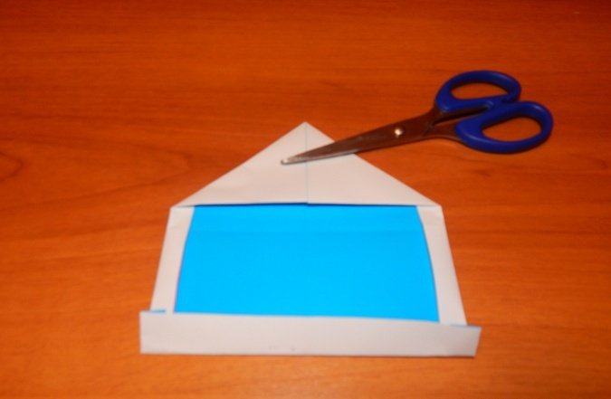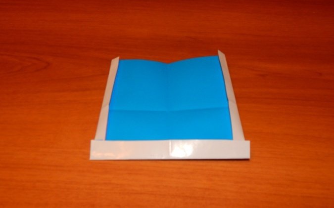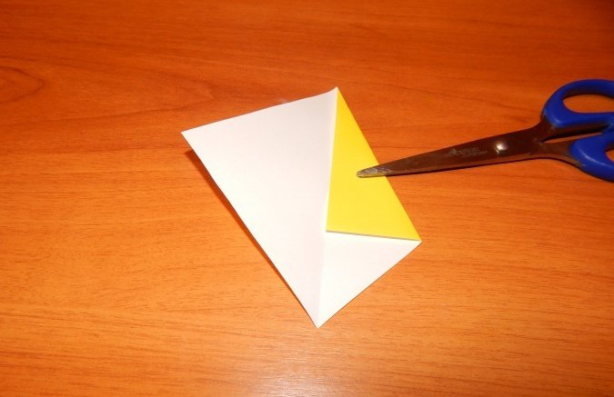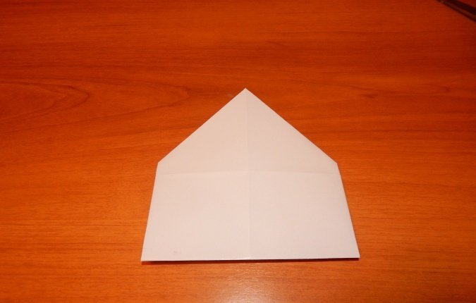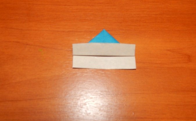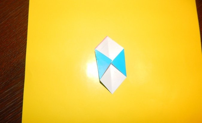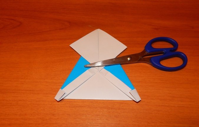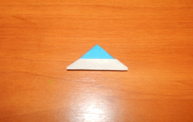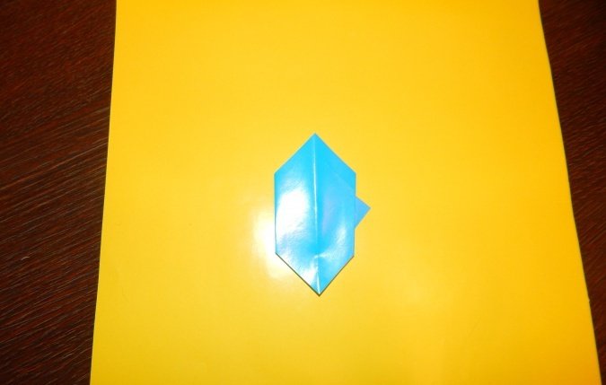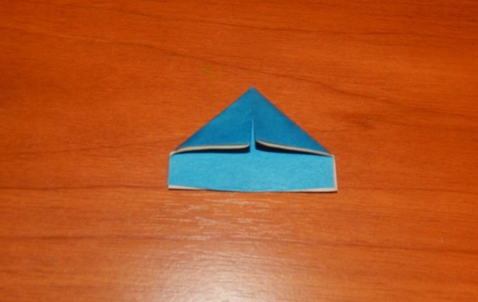Проводится складывание квадрата таким образом, чтобы сгибы диагоналей выступили слева и справа, а горизонтальные сгибы между ними были «утоплены». Получится равнобедренный треугольник.