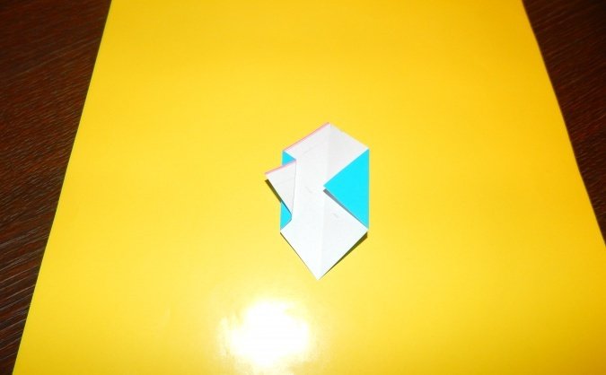 Разложенный треугольник с видимыми сгибами поворачивается одной из сторон вниз. Между верхней и нижней частями диагоналей слева делается сгиб бумаги вниз. Аналогичная работа проводится для правой стороны. Квадрат возвращается в исходное положение (разравнивается).