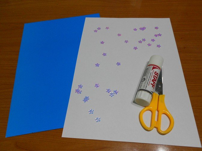 Четвертая страница (аналогичного размера) окрашивается голубой и синей краской, дополняется блестящими пайетками (наклейками) в виде звездочек.