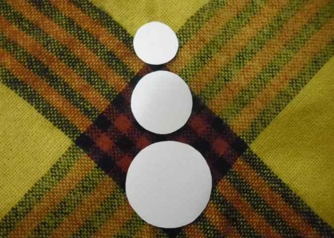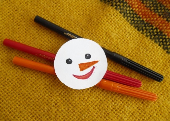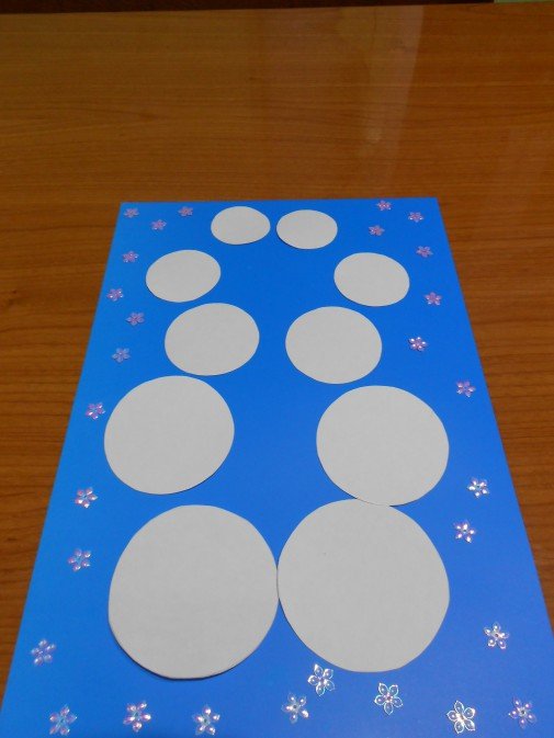 Приклеить кружок к голубому картону. Из черного картона вырезать небольшой цилиндр и глазки, приклеить снеговику.