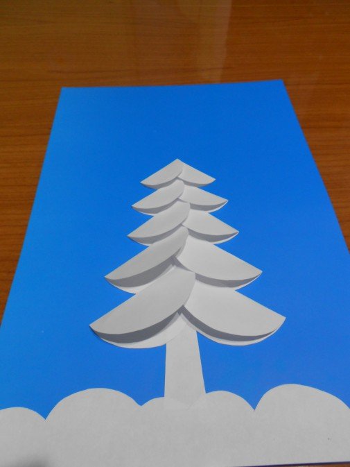 Выгнуть елочку (подарки) к себе, по ранее отмеченной ножницами вертикальной линии. Сам лист бумаги сложится выступающим рисунком внутрь.