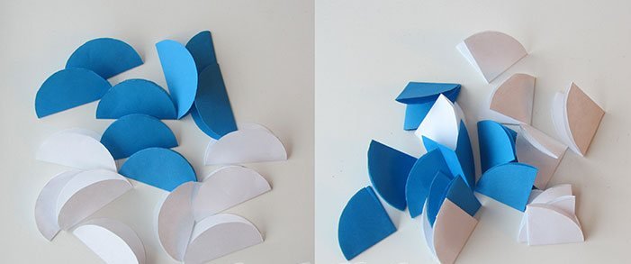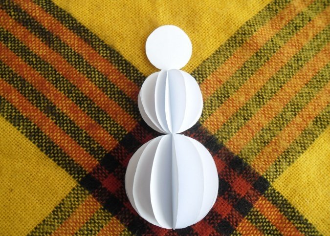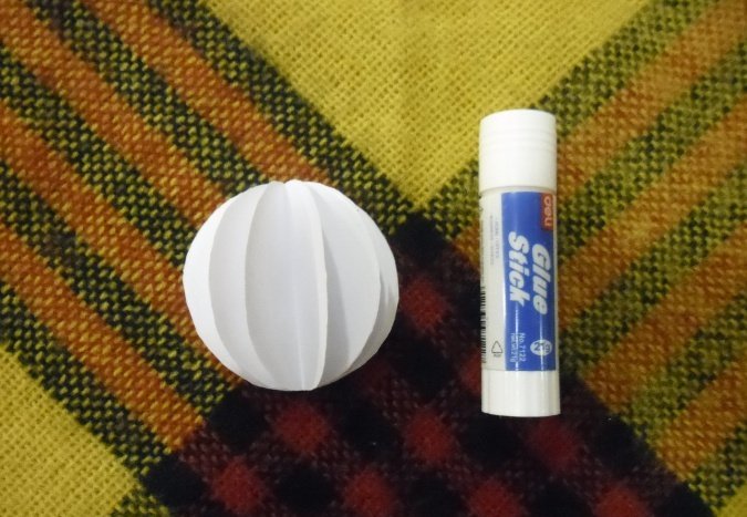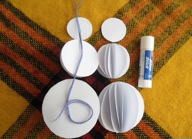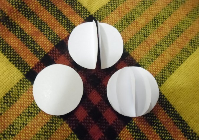 Склеить вместе половинки сложенных шаров (из 9 заготовок сделать 3 отдельных шарика).