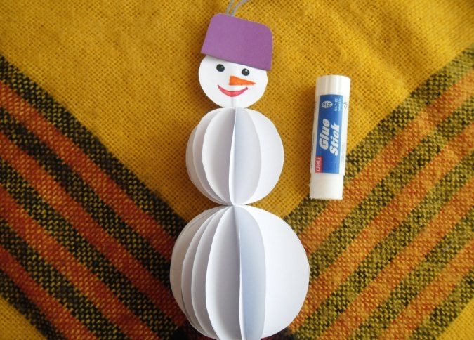 Из обычной бумаги можно сделать не только объемные елочки, но и другие тематические новогодние фигурки. Например, используя голубой, желтый и черный картон, белую бумагу, можно сделать своими руками такую открытку с объемным снеговиком: