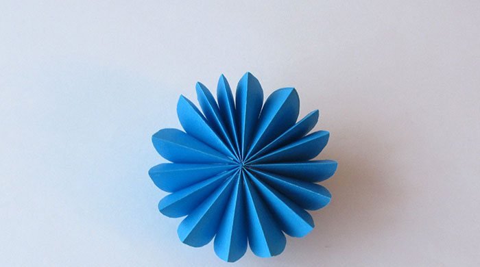 Краешки сложенного круга фигурно обрезать (можно по аналогии с вырезанием фигурных краешков для бумажных снежинок). Разложить заготовку и хорошо прогладить полученные ребра гармошки для формирования красивого объемного круга.