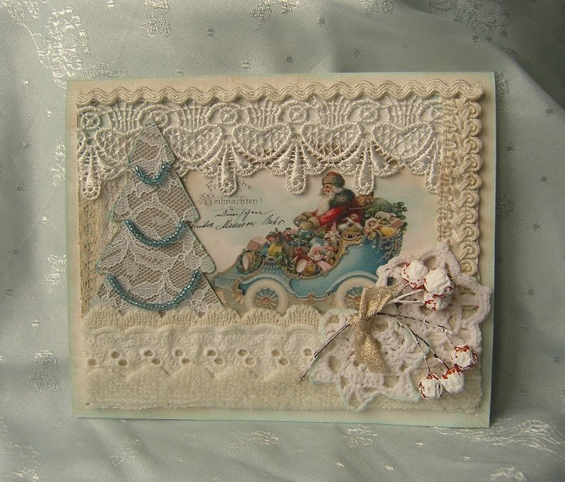кружева: приклеить на картон в форме елочки, сшить из кружева елочку и затем приклеить к открытке, использовать для обрамления периметра открытки или создания ажурной рамочки;