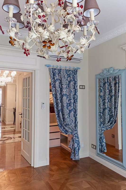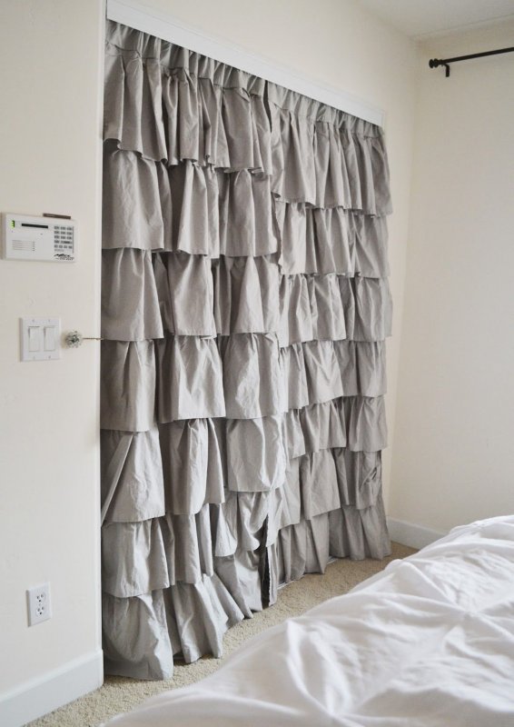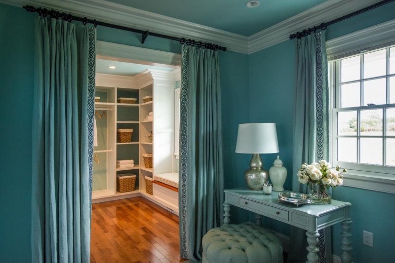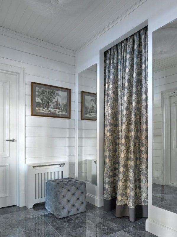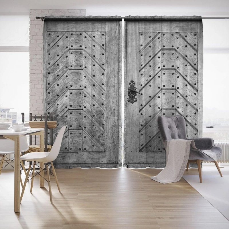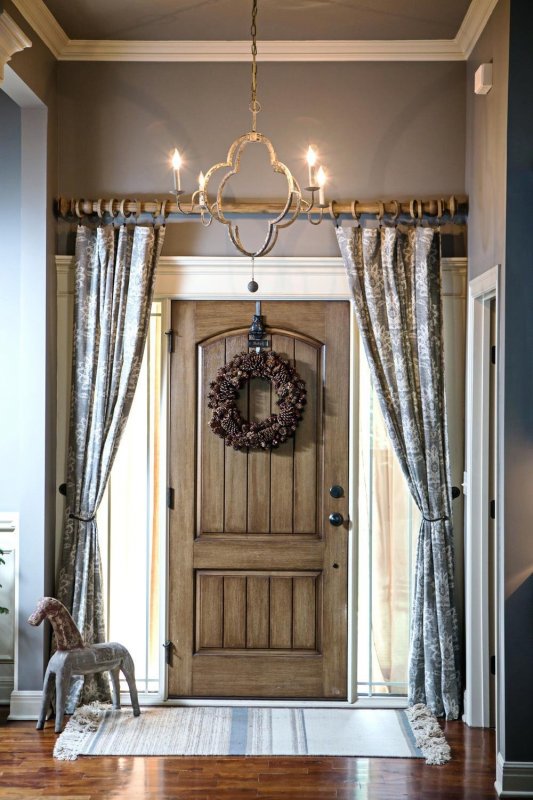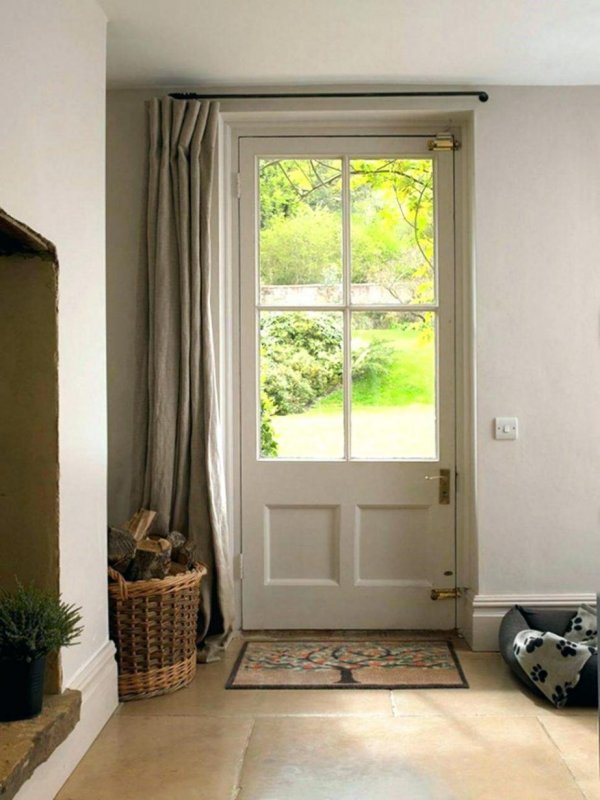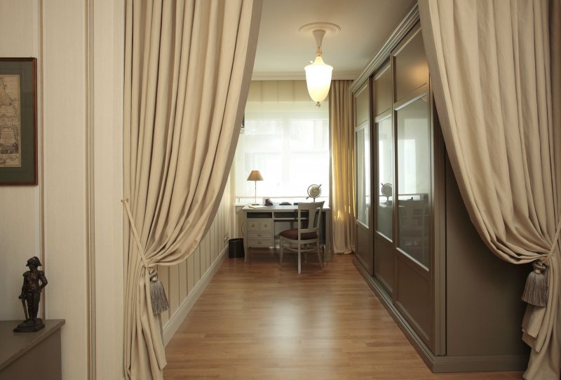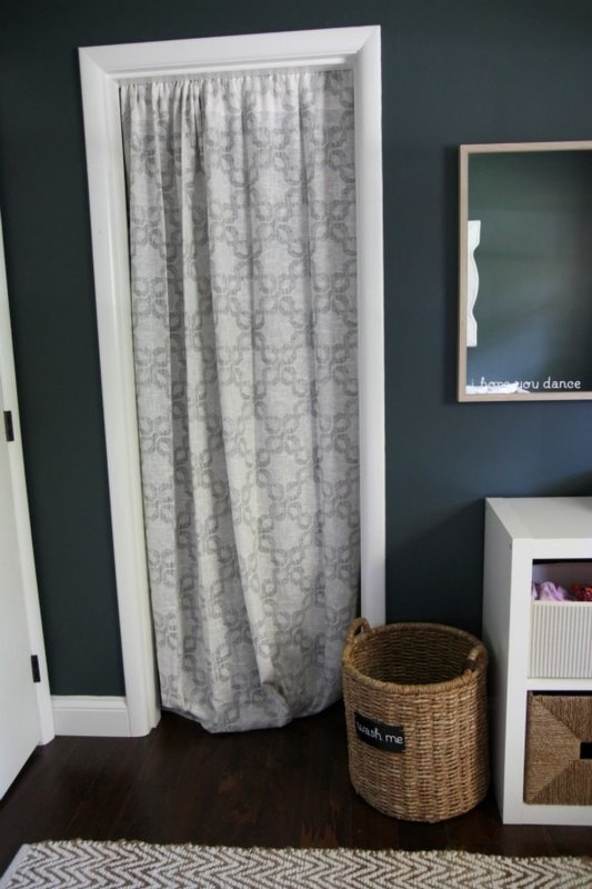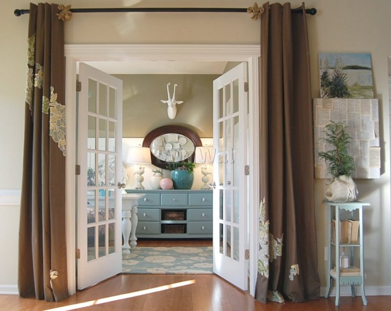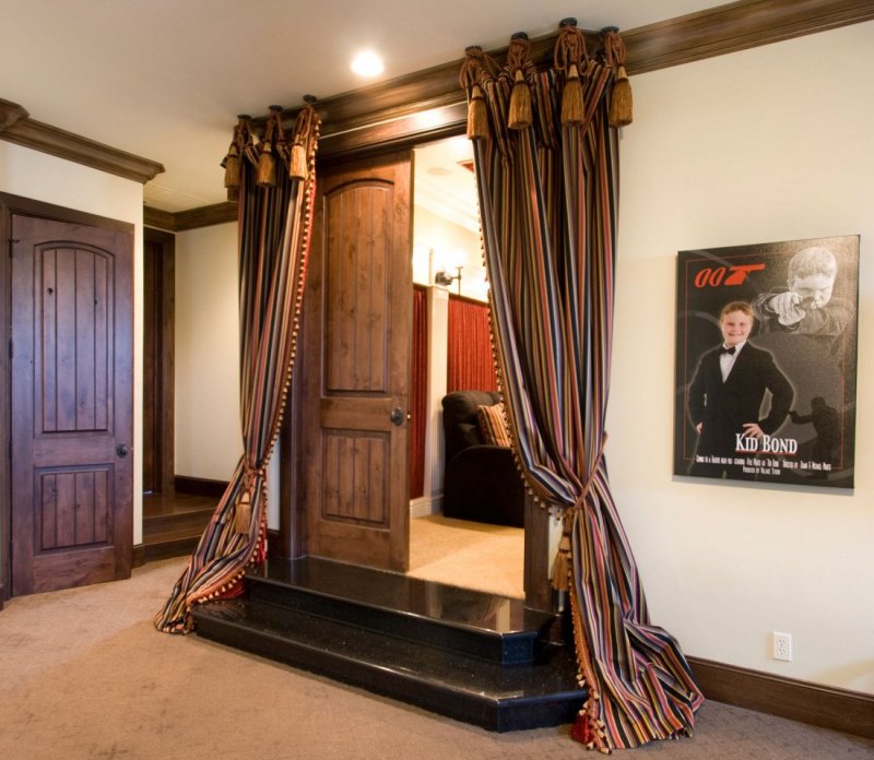 Если межкомнатная дверь неуместна в плане дизайна, ее лучше скрыть. Один из вариантов — драпировка шторами. Для этого используют изделия из декоративного текстиля. Их крепят на само полотно. Скрыть дверь можно и обычной тканью, но желательно, чтобы шторы имели декоративную составляющую. Украшающим материалом может выступать текстиль с рюшами и складками. Декор скрытых дверей необходимо согласовать со стилем оформления окон. В целом этот дизайнерский ход применим и к прозрачным и полупрозрачным дверям. Также появится возможность создания интересных компоновок из текстиля и стеклянных поверхностей, а параллельно с этим регулируется светопроницаемость. Чтобы шторы не падали, потребуется надежно закрепить их. Помимо этого, следует предусмотреть вопрос удобства — если занавеска все же будет мешать, то по краям двери стоит установить крепления.