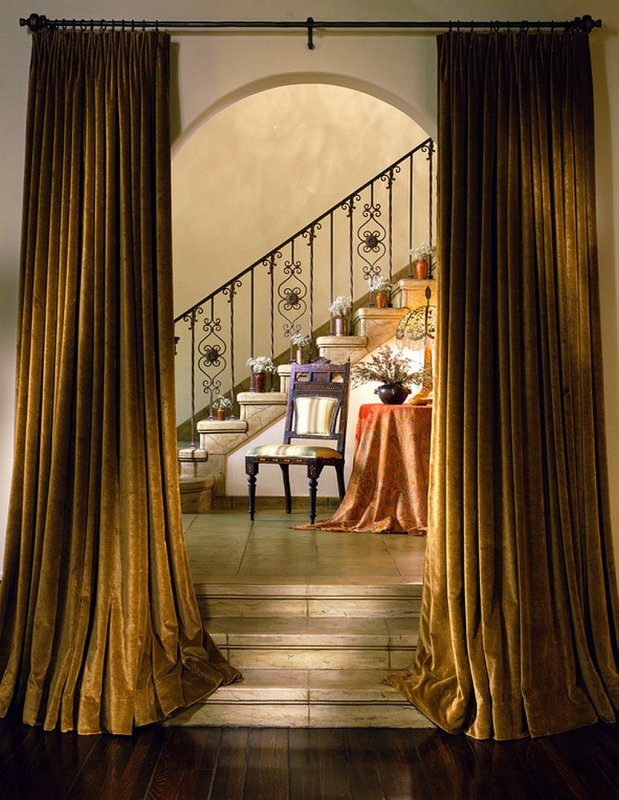 Занавесы из хлопка и льна используют не только на оконных проемах, но и в межкомнатном пространстве. Эти материалы создают насыщенные оттенки. Шторки из портьерного сатина или шелка подойдут для обустройства входа в любое из помещений. Жаккард и атлас выделяются своим роскошным видом. Занавески из этих материалов принято размещать с обеих сторон. Тем не менее, если такой декор не обоснован стилистически, то не рекомендуется его использовать. Шторки из жаккарда или атласа уместны в больших жилищах и широких помещениях.